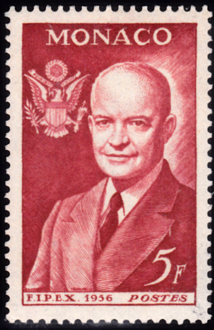 Auf einer Marke aus Monaco (MiNr 530) zur Internationalen Briefmarkenausstellung FIPEX in New York ist Dwight D. Eisenhower abgebildet.