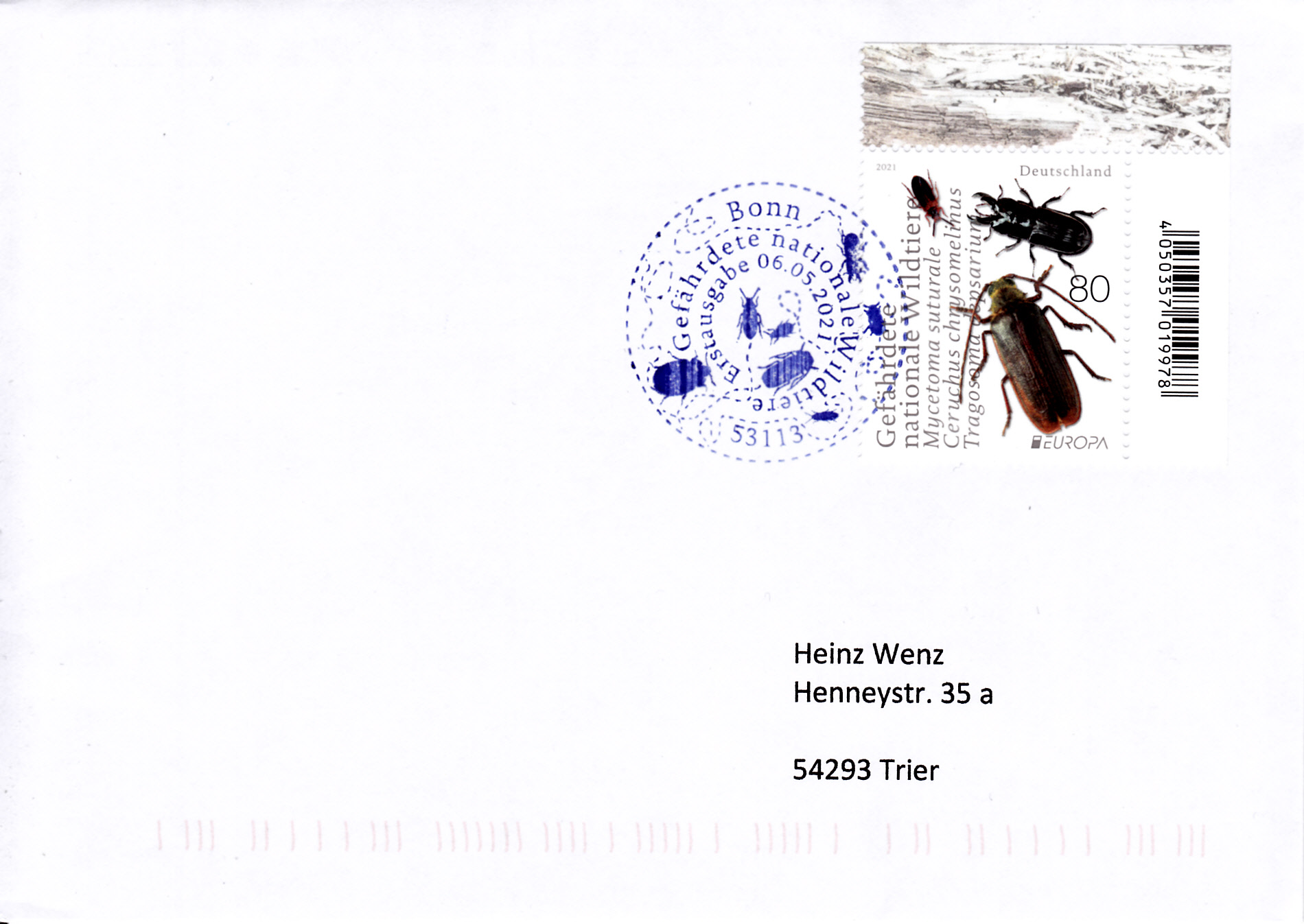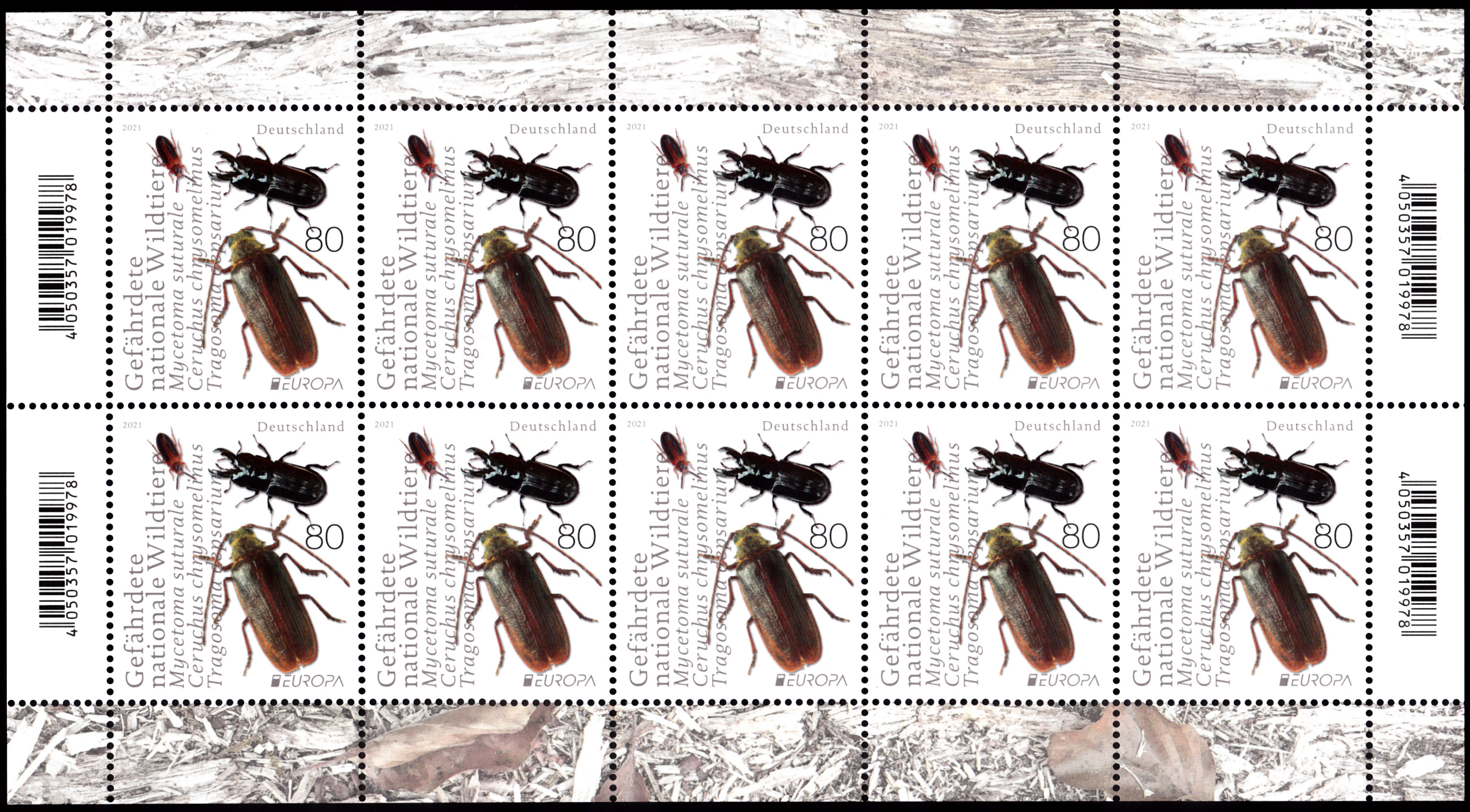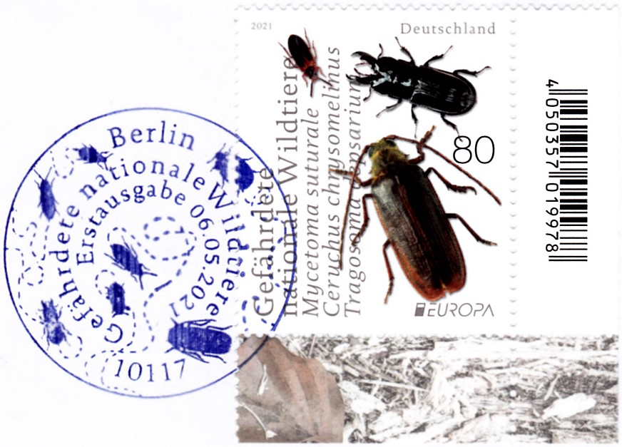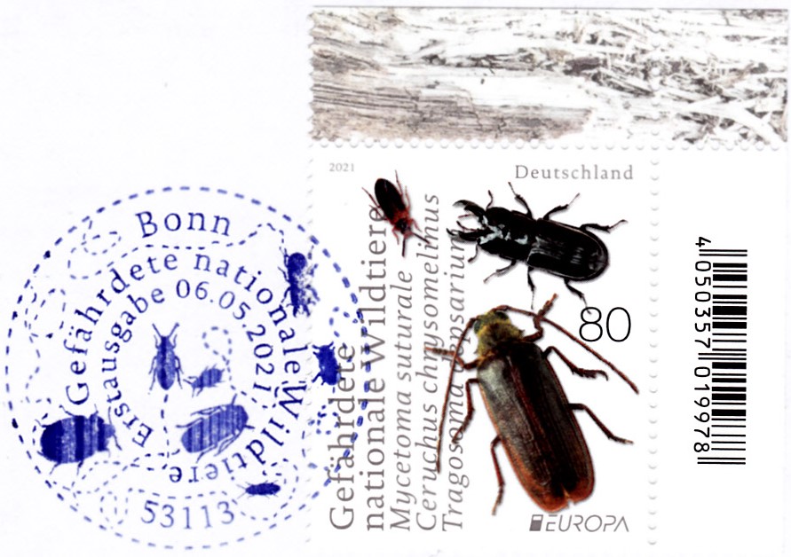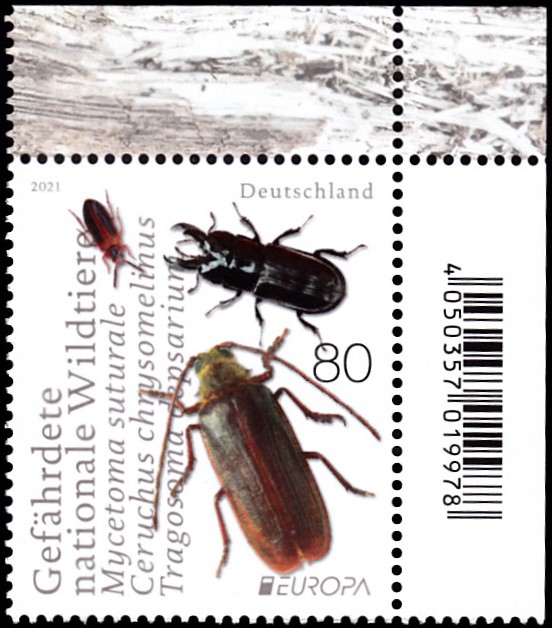 Die Europamarke 2021 ist bei der Deutschen Post am 6. Mai 2021 zum Thema "Gefährdete Wildtiere" erschienen. Die Marke zu 80 Cent zeigt folgende drei Käfer: den Harzporling-Düsterkäfer (Mycetoma suturale), den Rindenschröter (Ceruchus chrysomelinus) und den Zottenbock (Tragosoma depsarium).