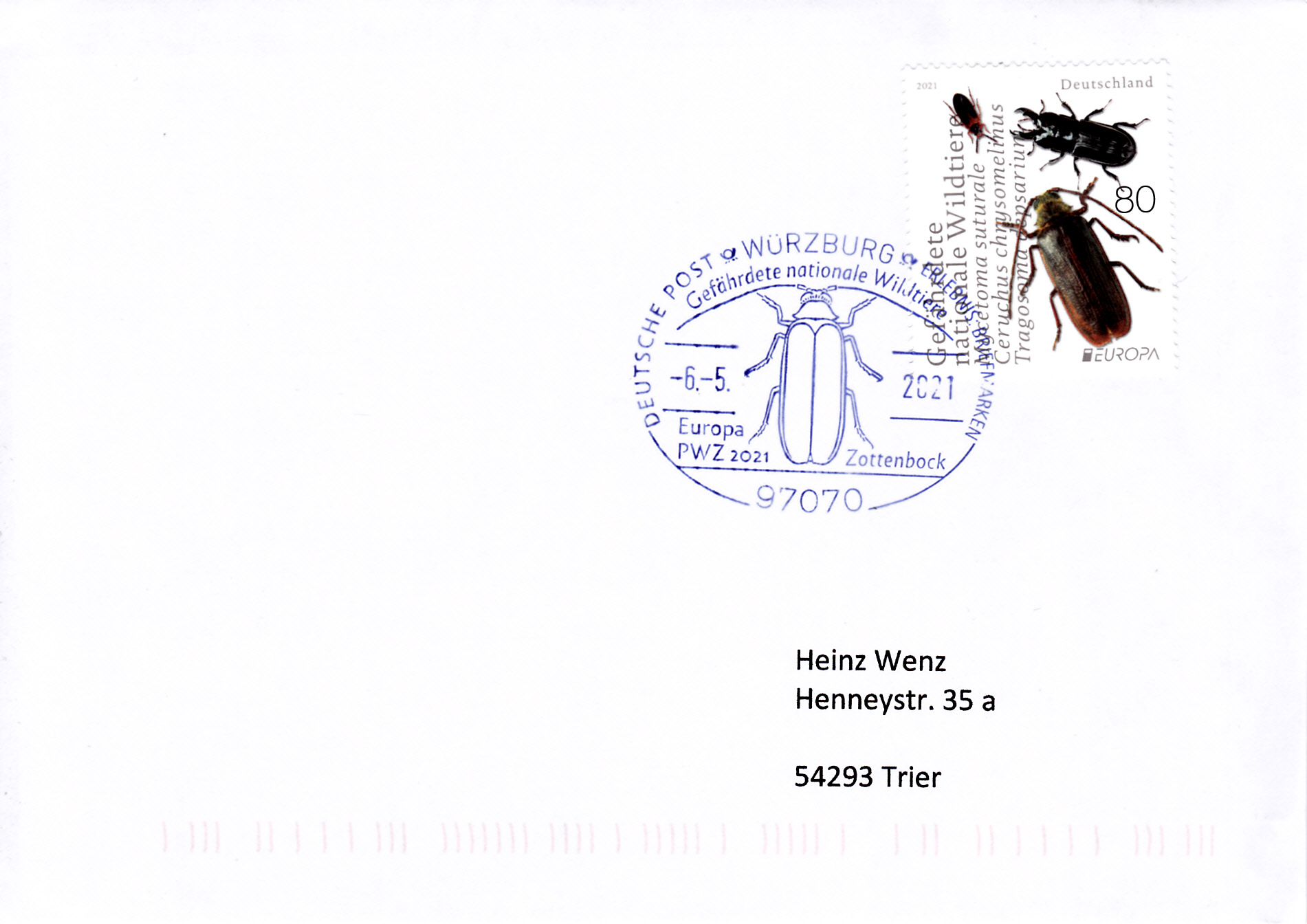 Auf diesem Brief wurde die Europamarke 2021 am Ausgabetag mit einem zur Markenausgabe passenden Sonderstempel aus Würzburg gestempelt.