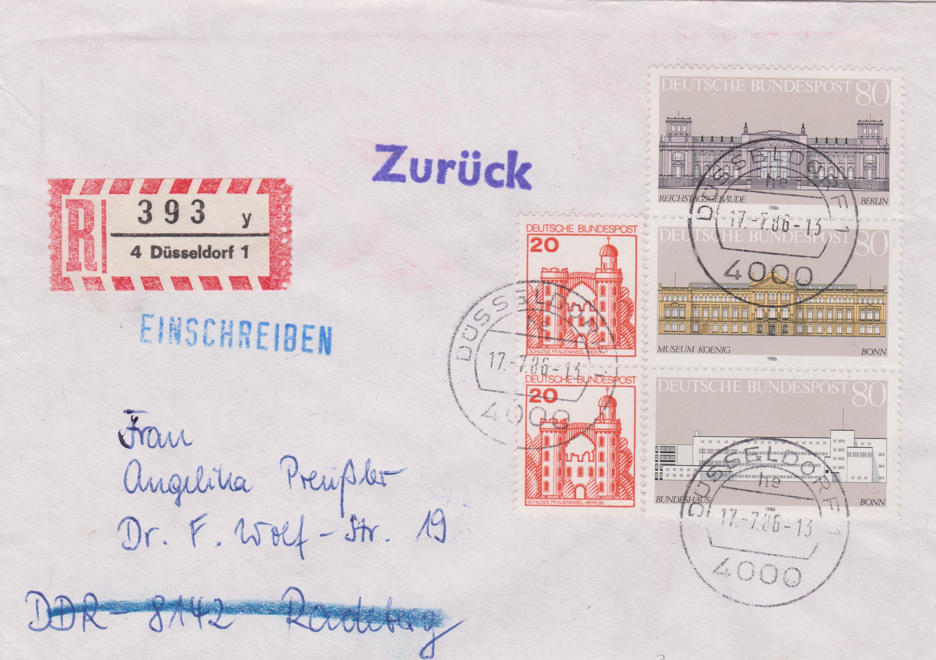 Dieser Beleg wurde von der DDR "zurück" gewiesen, weil die DDR die Bundesrepublik MiNr. 1287 nicht akzeptierte: