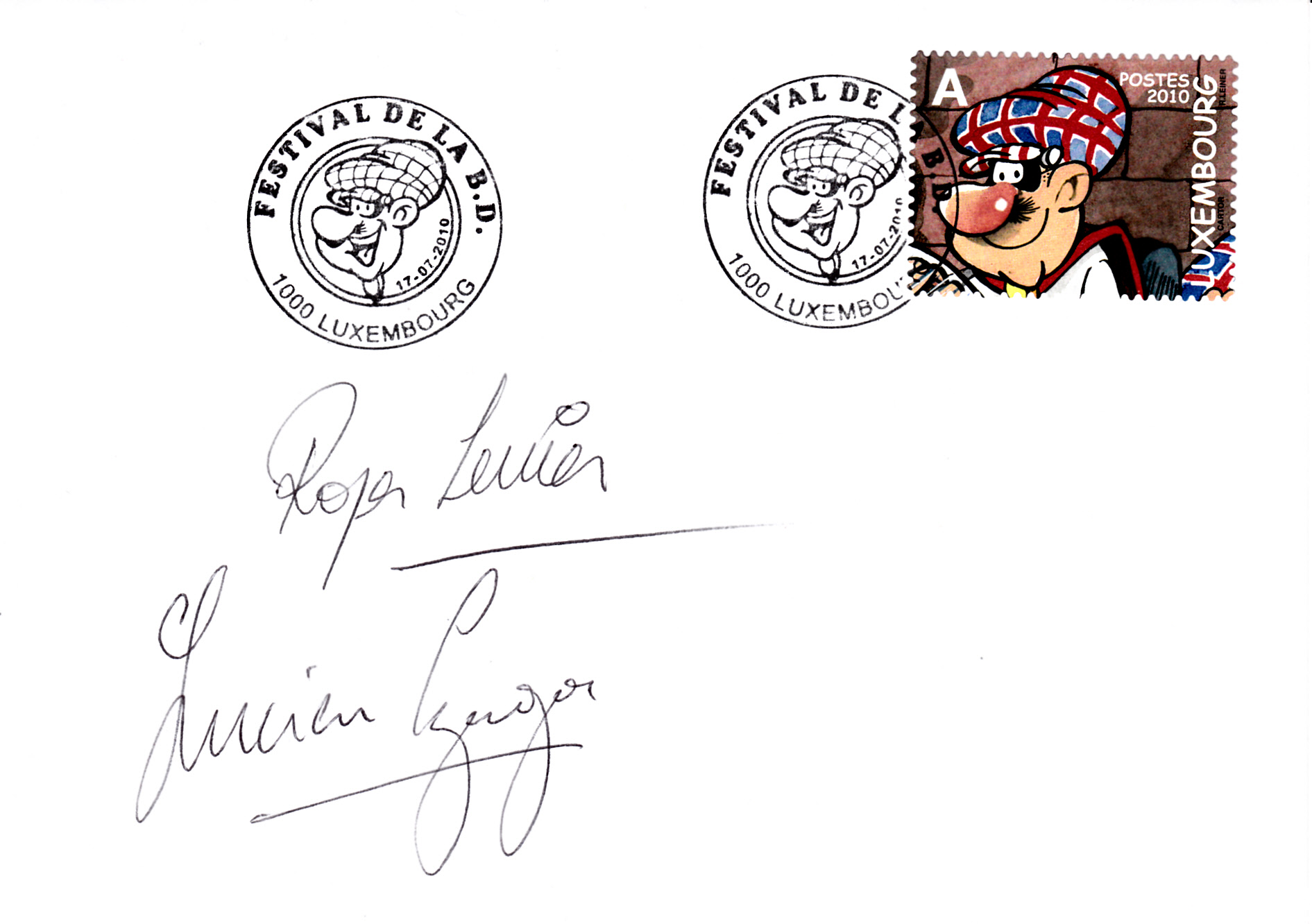 Ich kann hier alle fünf Marken mit diesem Stempel und den Unterschriften von Roger Leiner (1955 - 2016; luxemburgischer Komikzeichner, Illustrator und Karikaturist) und Lucien Czuga (Autor), die zusammen den Comic "Superjhemp" auf den Markt brachten.