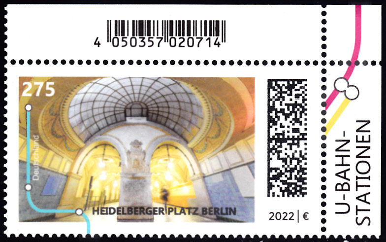 Im Rahmen der Sonderpostwertzeichen-Serie "U-Bahn-Stationen" erschien im März 2022 eine Marke zur U-Bahn-Station Heidelberger Platz in Berlin (MiNr 3674). Der U-Bahnhof Heidelberger Platz entstand als Bahnhof der U-Bahn zwischen Wilmersdorf und Dahlem, der heutigen U-Bahn-Linie U3. Die Eröffnung des mit Hb abgekürzten Bahnhofs fand am 12. Oktober 1913 statt.
