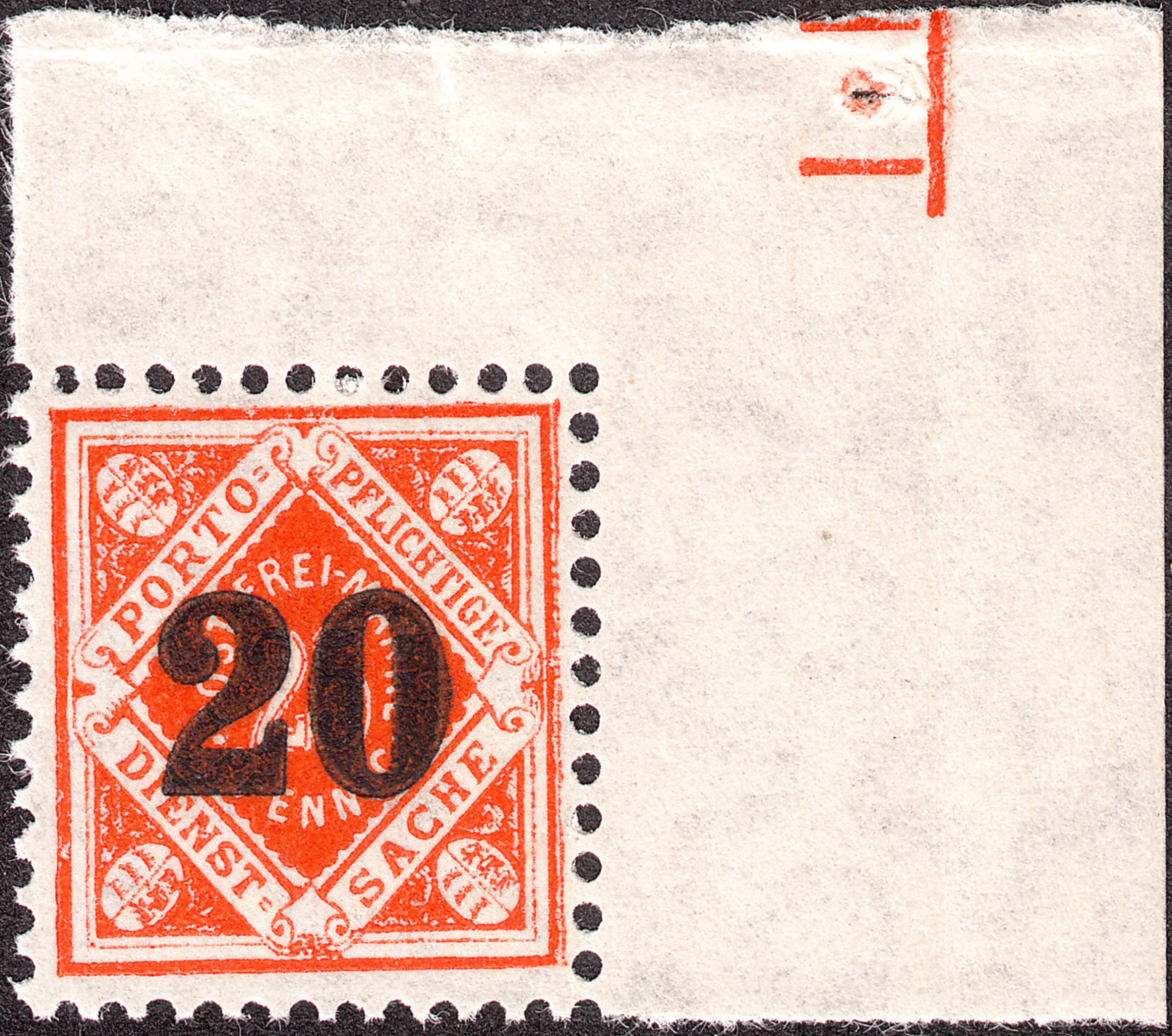 Ferner findet sich bei diesem Exemplar am Bogenrand rechts oben eine Markierung in Markenfarbe sowie ein Nadelpunkt.