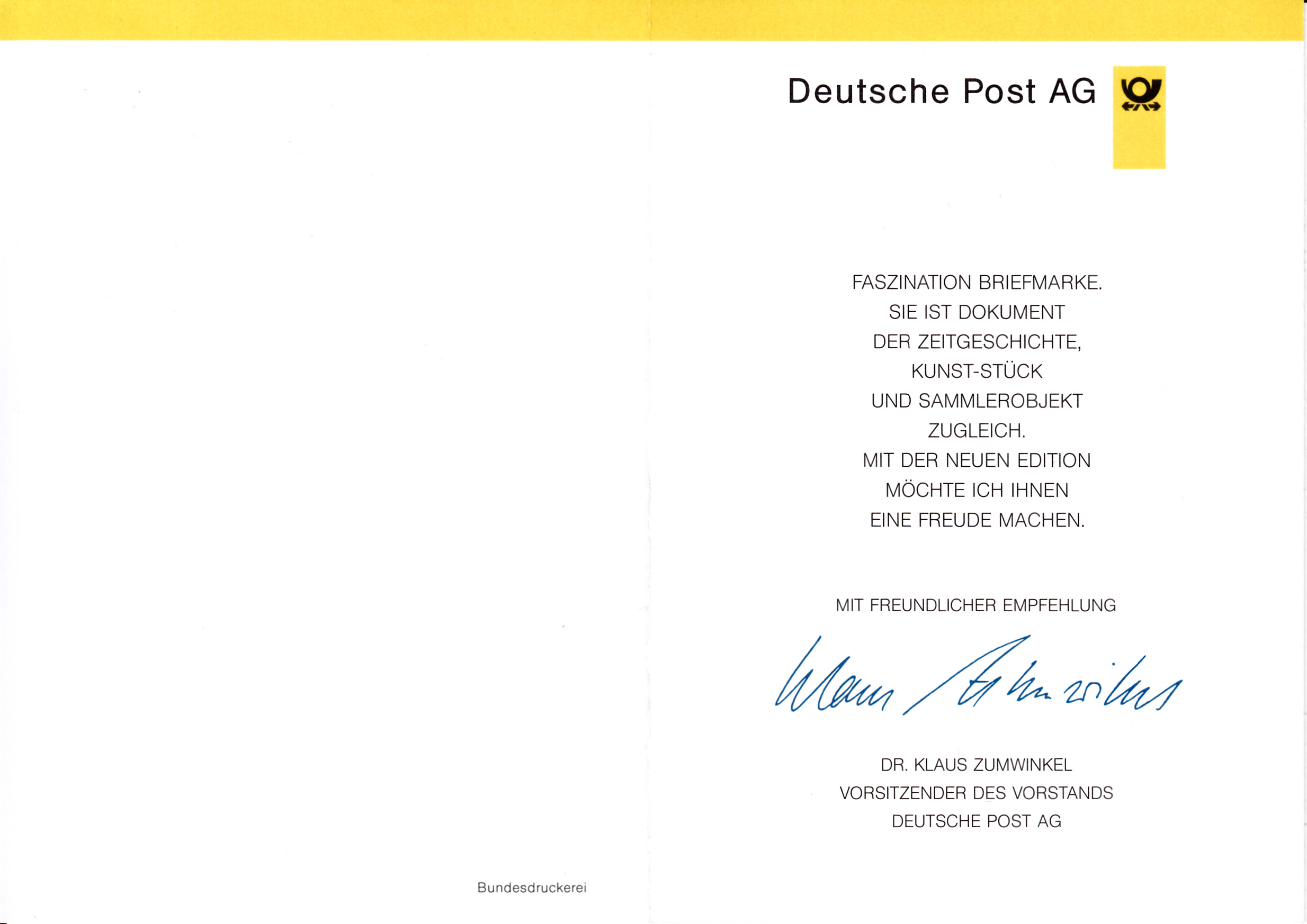 Klappkarte des Vorstandsvorsitzenden der Deutschen Post AG mit der Marke zur Kampagne gegen Drogenmissbrauch (MiNr 1882) und dem Ersttagsonderstempel Bonn.