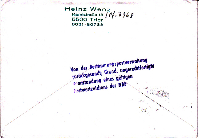 Hier ein Brief vom 2.9.1986 von Trier nach Magdeburg. Auf der Vorderseite wurde in der DDR der Stempel "Zurück" angebracht und der Bestimmungsort durchgestrichen. Rückseitig sehen wir einen Stempelabdruck des Postamtes Hannover 3, der die Rücksendung des Briefes erläutert.