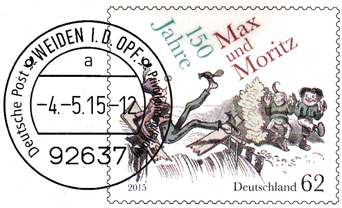 Eine weitere Marke (MiNr 1492) der Serie zeigt Max und Moritz im Markenbild.