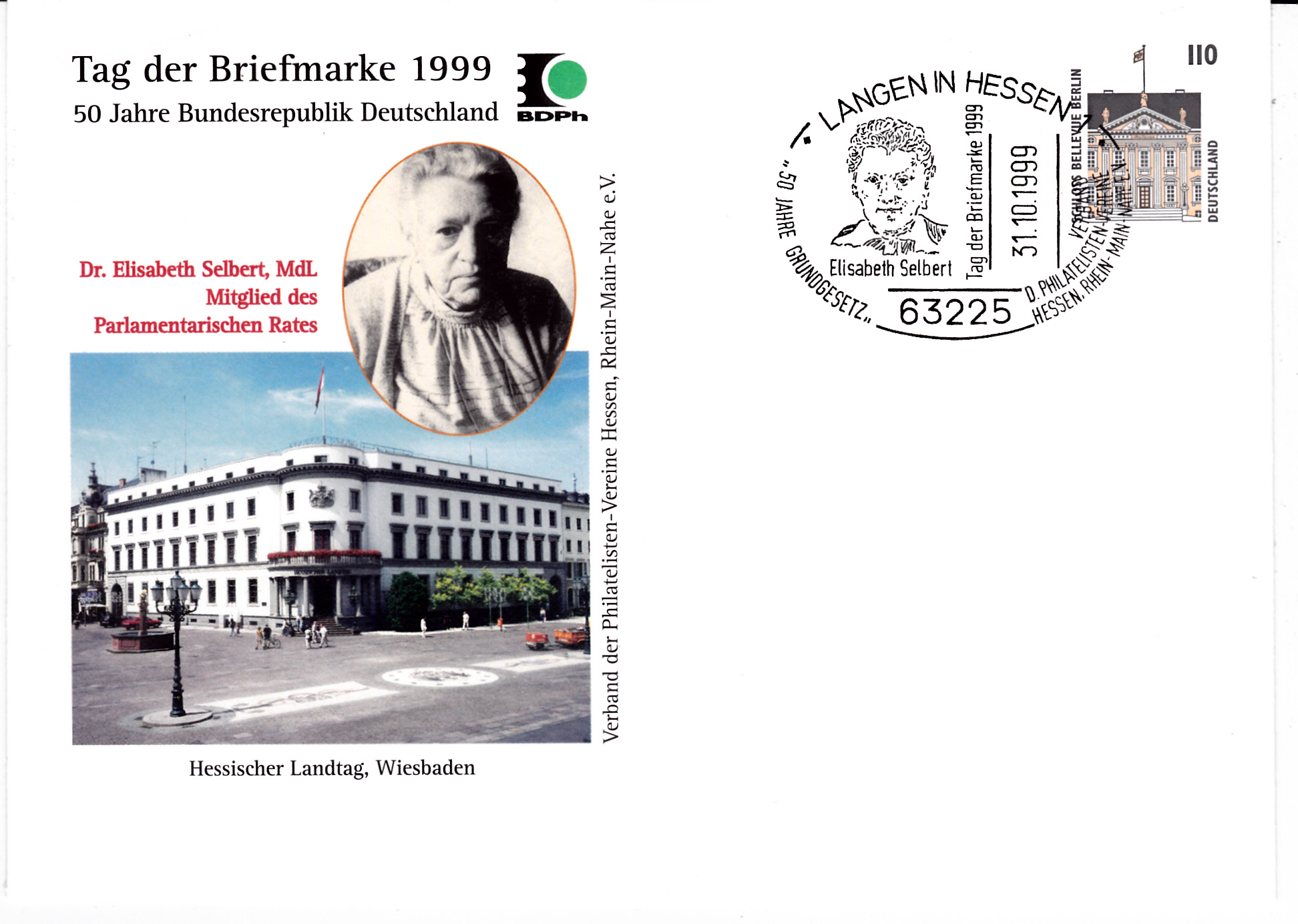 Ganzsache des Verbandes der Philatelisten-Vereine Hessen, Rhein-main-Nahe e.V. mit dem dazu passenden Sonderstempel vom 31.10.1999 aus Langen zum Tag der Briefmarke 1999.