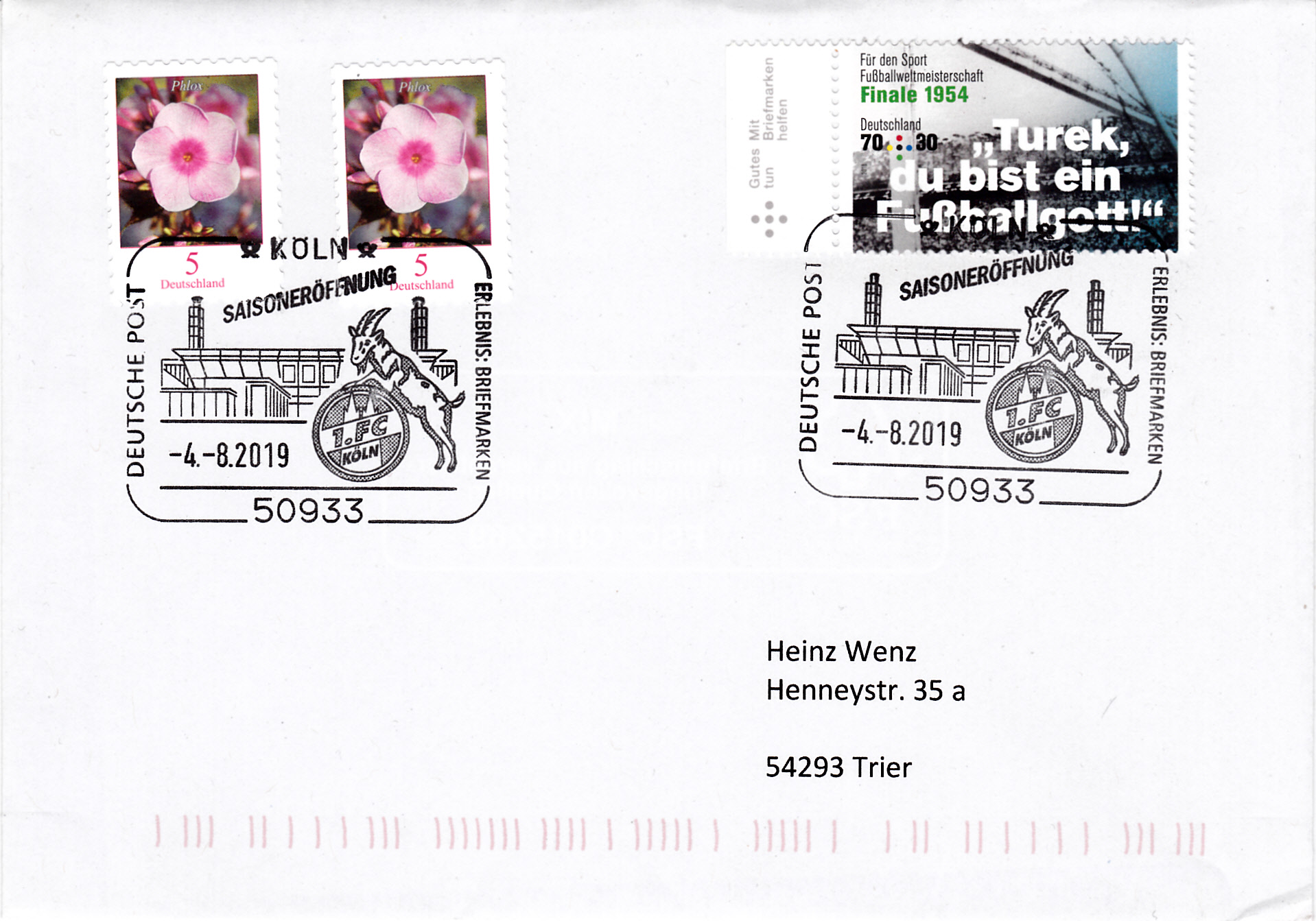 Im Sonderstempel zur Eröffnung der Bundesligasaison 2019/20 wurde am 4.8.2019 wird der Eingang zum RheinEnergieSTADION gezeigt.
