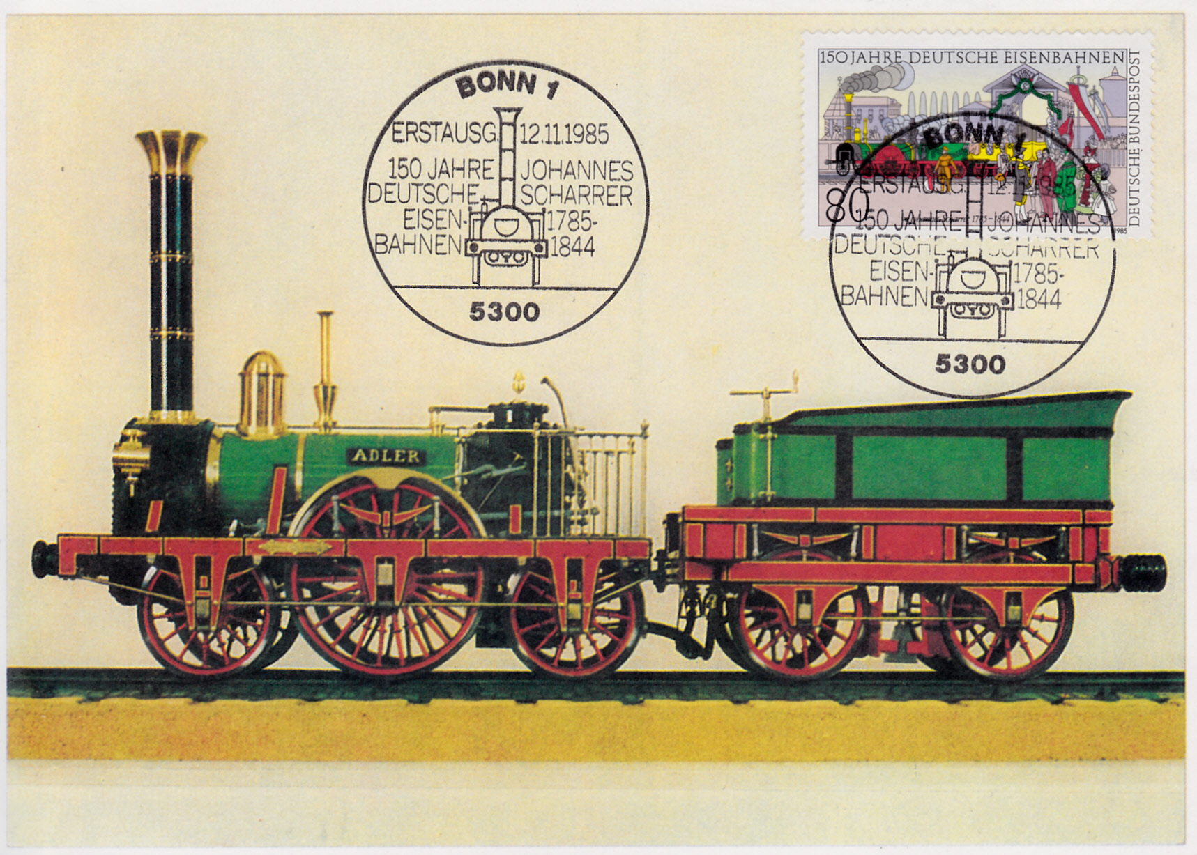 Maximumkarte mit der Marke zum Jubiläum "150 Jahre Deutsche Eisenbahn" der Deutschen Bundespost (MiNr 1264) wurde und dem Ersttagsonderstempel Bonn. Die Karte zeigt die "Erste Fahrt des Adler von Nürnberg nach Fürth am 7. Dezember 1835" (Vorlag für das Markenbild).