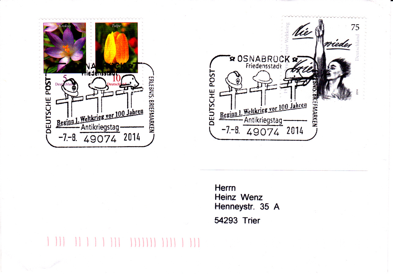 Hier nun ein Ersttagsbrief mit dem ESST Bonn vom 7.8.2014 mit dem Text "Nie wieder" und der Jahreszahl 1914.