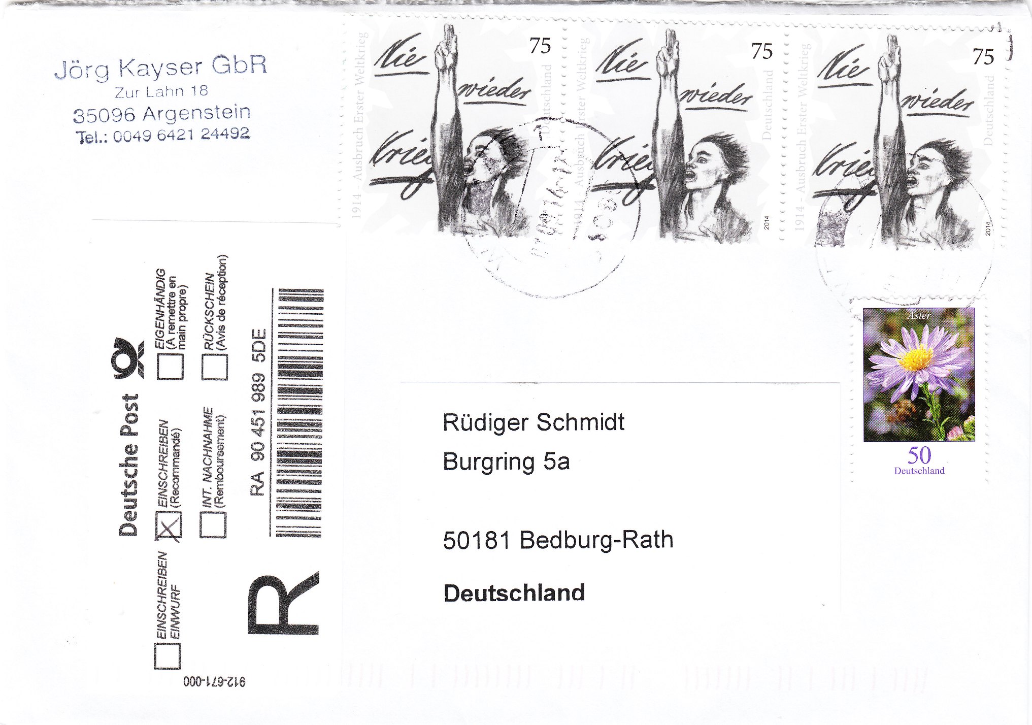 Hier die 2014 zum 100. Jahrestag des Ausbruchs des Ersten Weltkriegs erschienene Sondermarke gleich im waagerechten Dreierstreifen als portogerechte MiF auf einem Brief per Einschreiben: