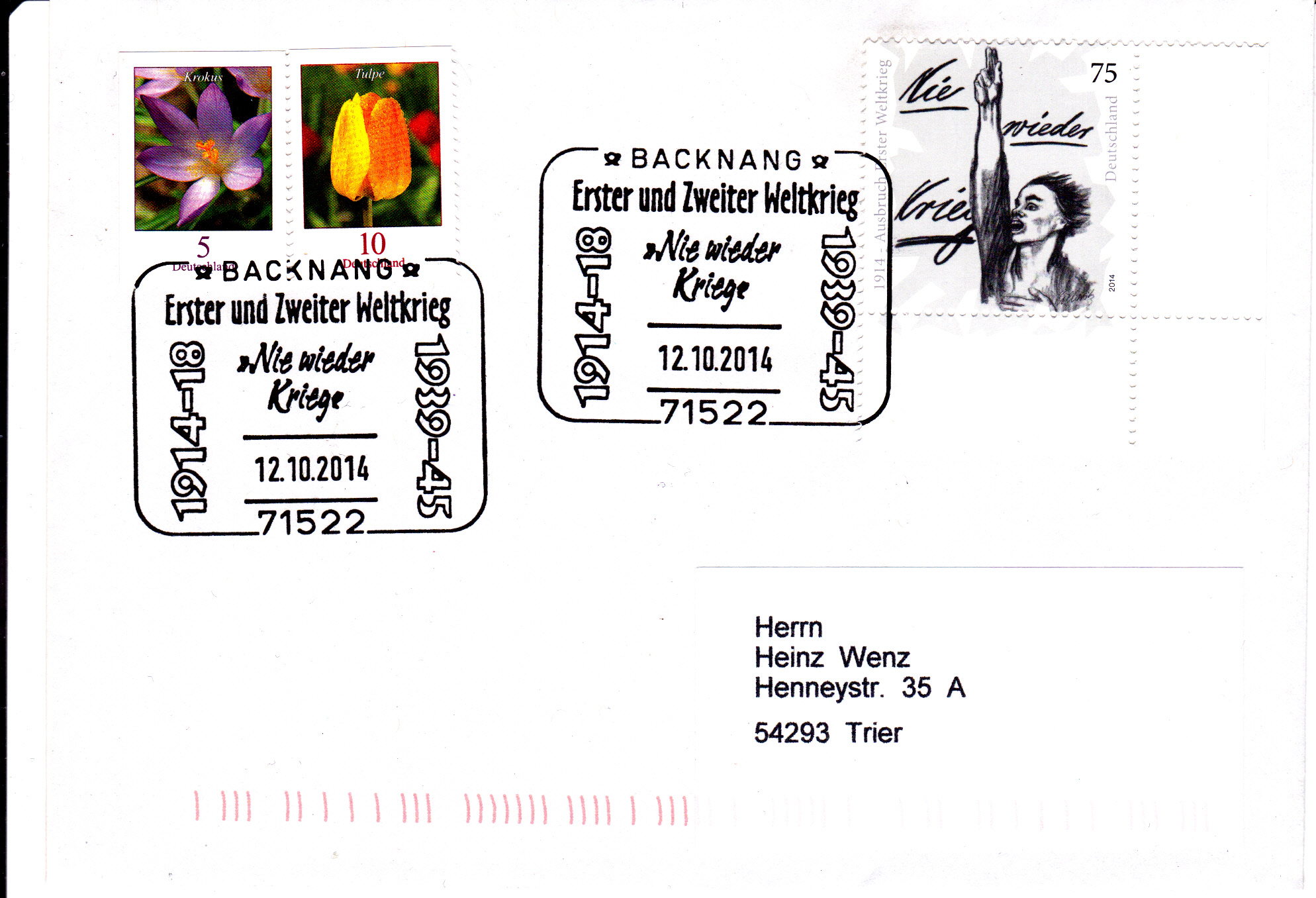 Hier ein weiterer Brief mit der Marke MiNr 3100 zum Ausbruch des 1. Weltkrieges mit einem Sonderstempel aus 71522 Backnang mit der Inschrift " Erster und Zweiter Weltkrieg, Nie wieder Kriege" und den Jahreszahlen der beiden Weltkriege.
