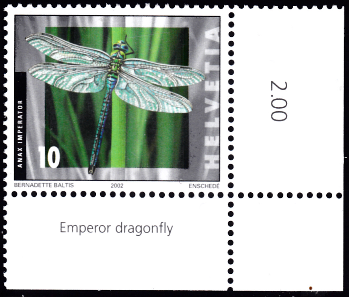 In der Schweiz ist eine Marke (MiNr 1802) mit einer Großen Königslibelle (Anax imperator) erschienen. Hier zeige ich ein Eckrandstück mit dem englischen Namen auf dem unteren Bogenrand.