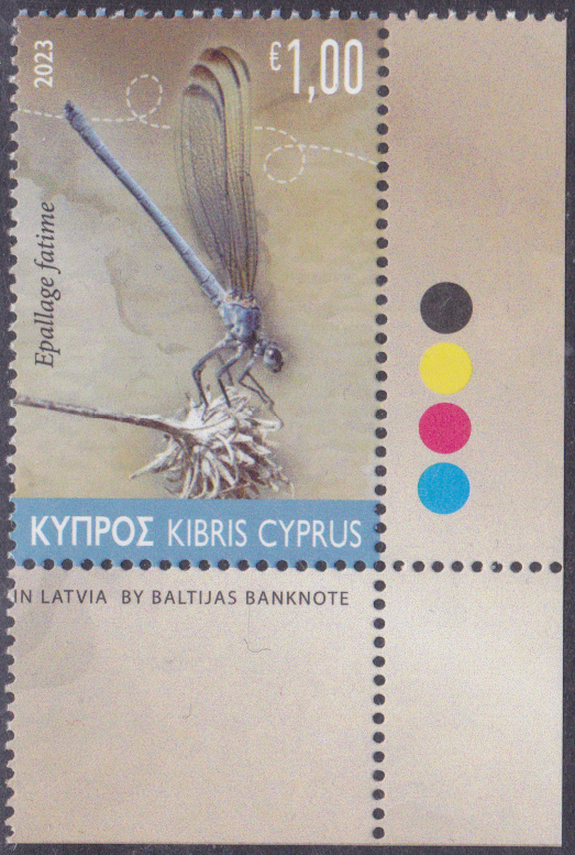 Eine Marke aus Zypern (MiNr 1504) bildet eine Blaue Orientjungfer (Epallage fatime) ab.
