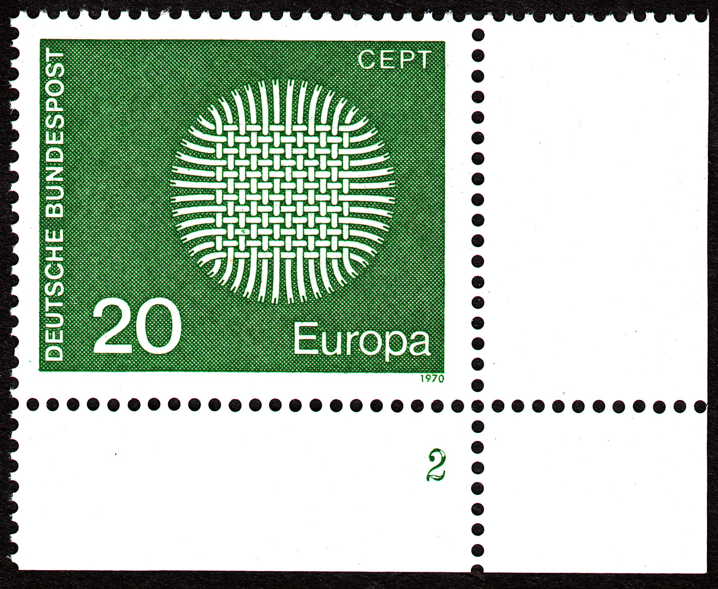 Die Europamarke 1970 der Wertstufe zu 20 Pfennig erschien am 04.05.1970 in einer Auflage von 50 Millionen Stück in 1 Million Bögen zu jeweils 50 Stück.