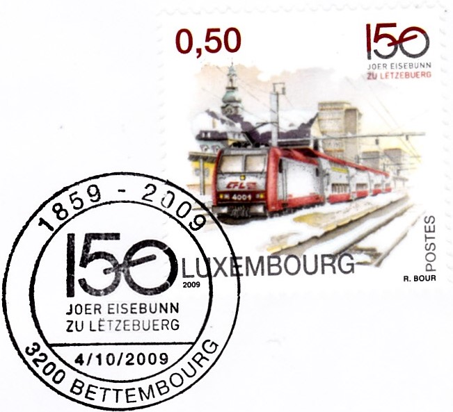 Die Marke zu 0,50€ (MiNr 1838) wurde auf diesem Brief mit dem Sonderstempel vom 4.10.2009 zu Jubiläum "150 Jahre Eisenbahn in Luxemburg" gestempelt.
