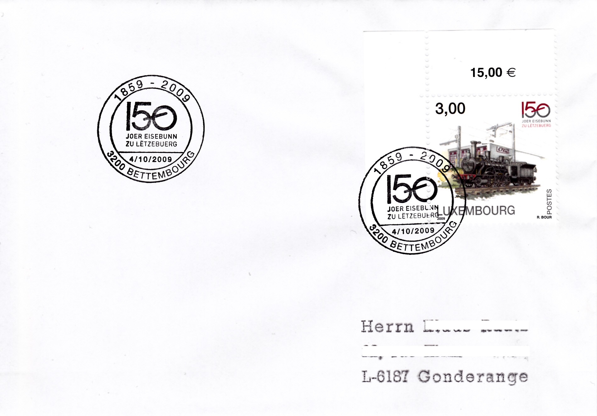 Die Marke zu 3,00€ (MiNr 1840) wurde auf diesem Brief ebenfalls mit dem Sonderstempel vom 4.10.2009 zum Jubiläum "150 Jahre Eisenbahn in Luxemburg" gestempelt.