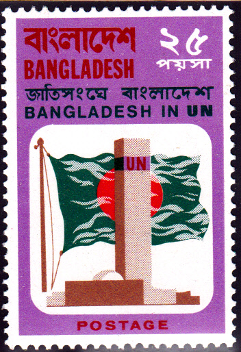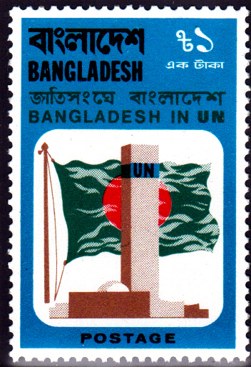 Zum UNO-Beitritt Bangladeschs wurden am 25.September 1974 diese beiden Marken herausgegeben, die das UNO-Gebäude vor der Flagge von Bangladesch zeigen.