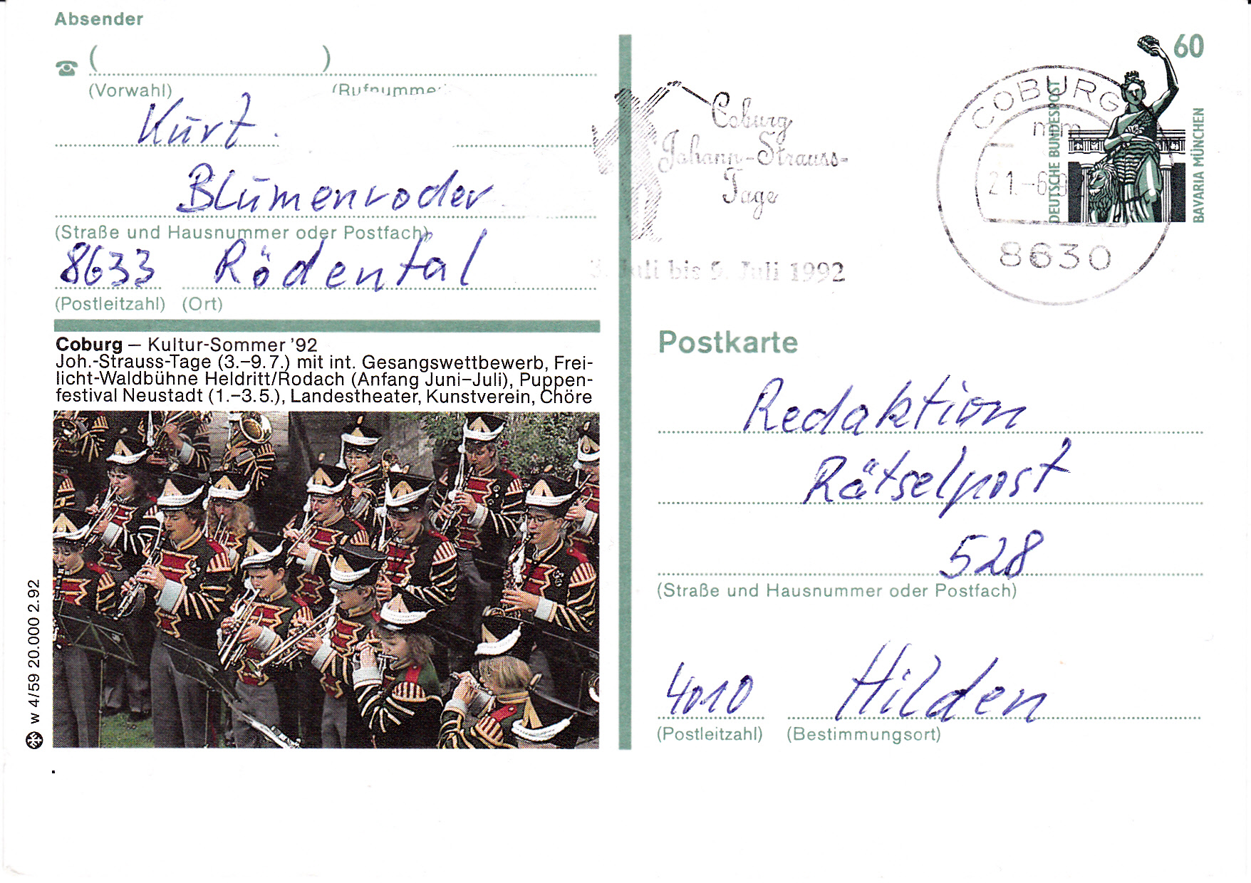 Bildpostkarte aus der Serie 2.92 mit Werbung für den Coburger Kultur-Sommer mit den Johann-Strauss-Tagen vom 3.-9.7.1993.