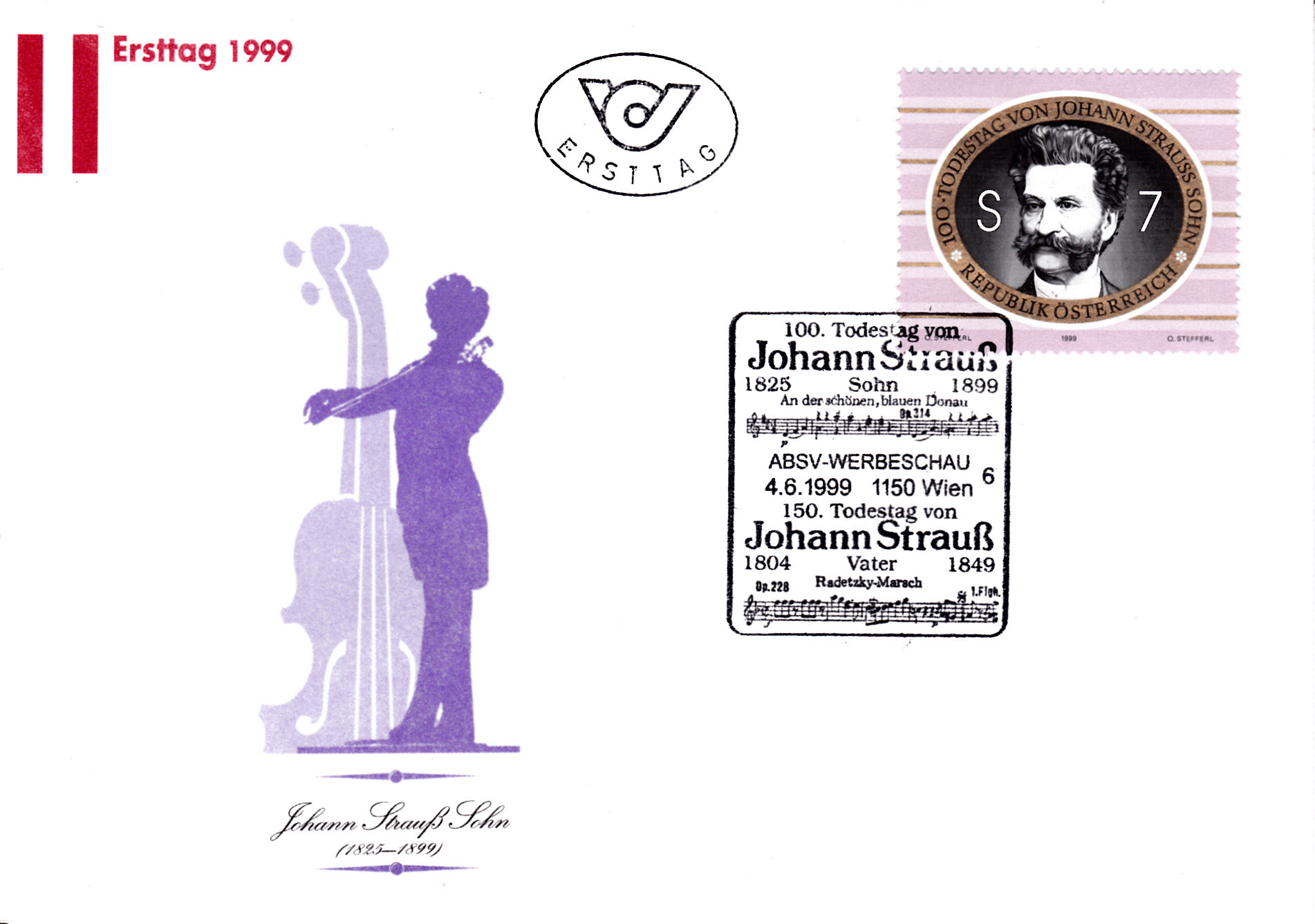 Auf diesem FDC wurde die Marke mit einem Sonderstempel zum 100. Todestag von Johann Strauß Sohn und zum 150. Todestag von Johann Strauß aus Wien mit der Kennziffer "6" gestempelt.