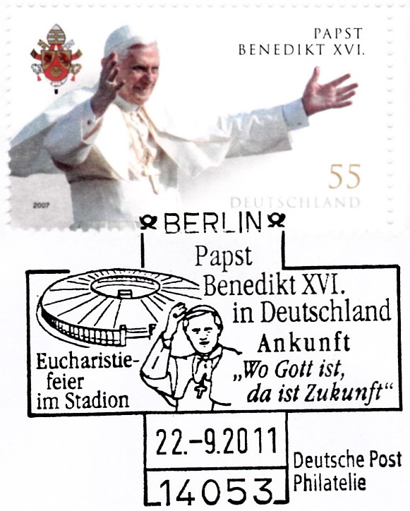 Dieser Sonderstempel vom 22.9.2011 aus Berlin dokumentiert die Ankunft des Papstes und die Messe im Olympiastadion. Der Stempel hat eine für die Deutsche Post recht ungewöhnliche Form.