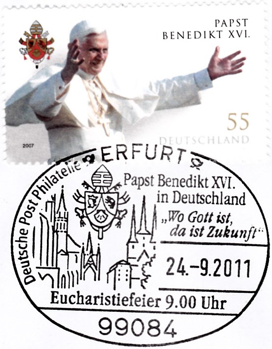 Ein Sonderstempel vom 23.9.2011 aus Erfurt dokumentiert den Besuch von Papst Benedikt XVI. in Erfurt.