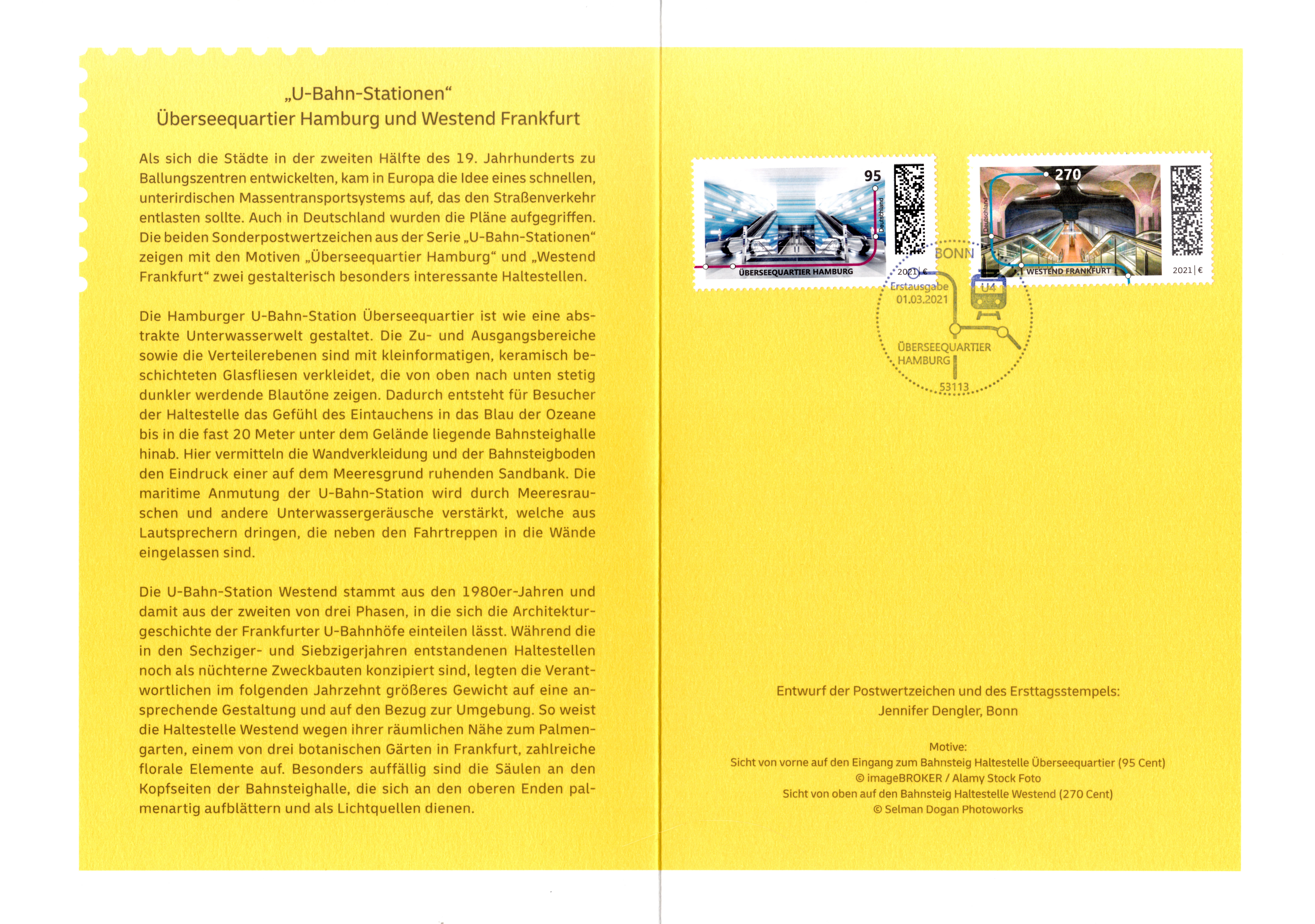Ministerkarte des Bundesministers für Finanzen mit den beiden Marken der Deutschen Post (MiNr 3593/3594) der Serie "U-Bahn-Stationen" mit den Motiven "U-Bahn-Haltestelle Überseequartier, Hamburg" und "U-Bahn-Haltestelle Westend, Frankfurt". Eine Marke ist mit dem Ersttagsonderstempel aus Bonn und die andere Marke mit dem aus Berlin gestempelt.
