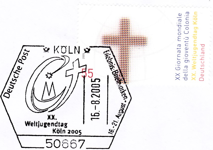 Dazu zeige ich hier den Sonderstempel aus Köln vom 16.8.2005 auf einem Brief nach Cuxhaven. Als Frankatur wurde passend die Marken zum Weltjugendtag (MiNr 2469) verwendet.