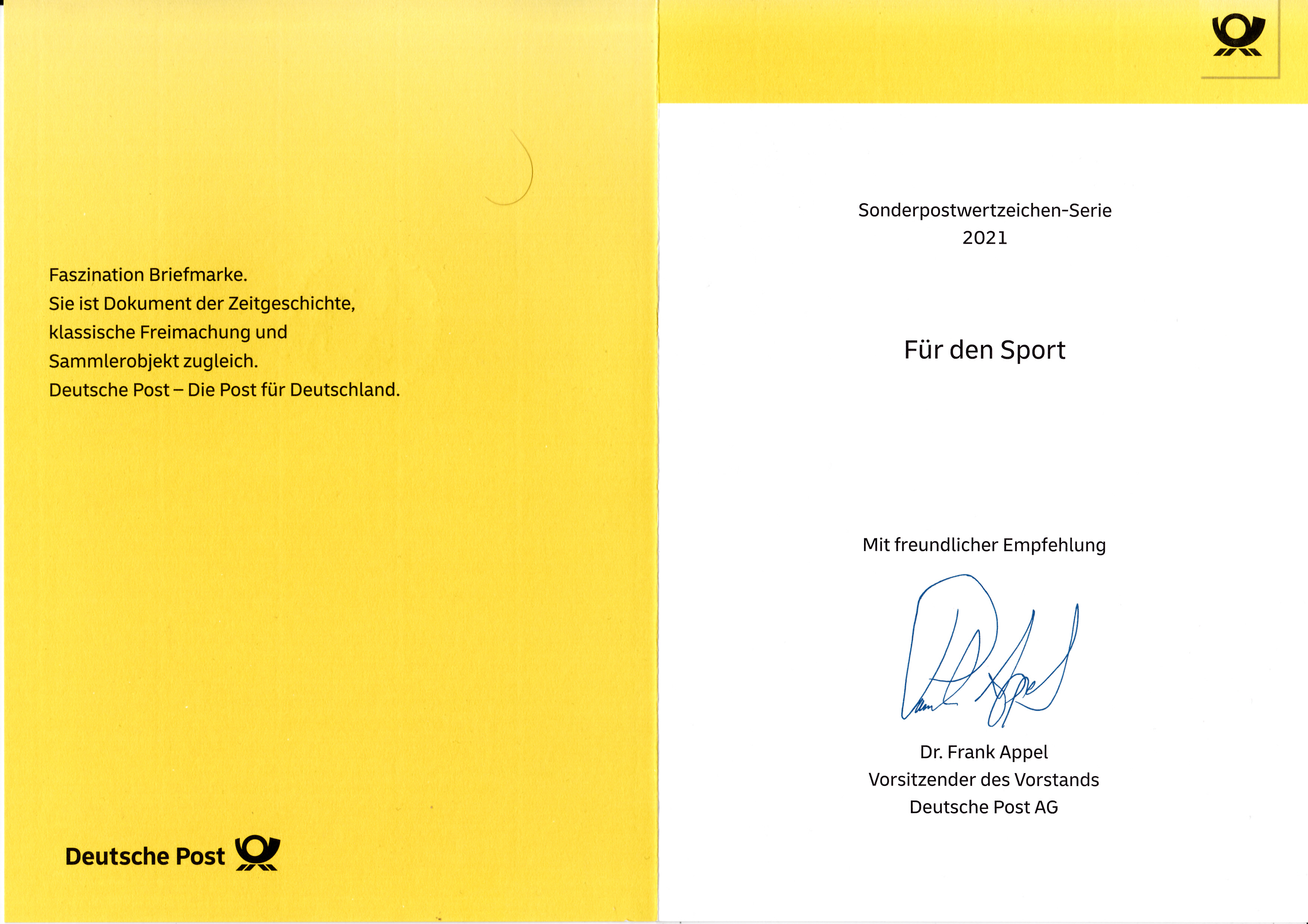 Klappkarte des Vorstandsvorsitzenden der Deutschen Post AG mit den Marken für die Sporthilfe 2021 (MiNr 3602 bis 3604) mit Motiven zu "Neue olympische Sportarten" und dem Ersttagsonderstempel Bonn.