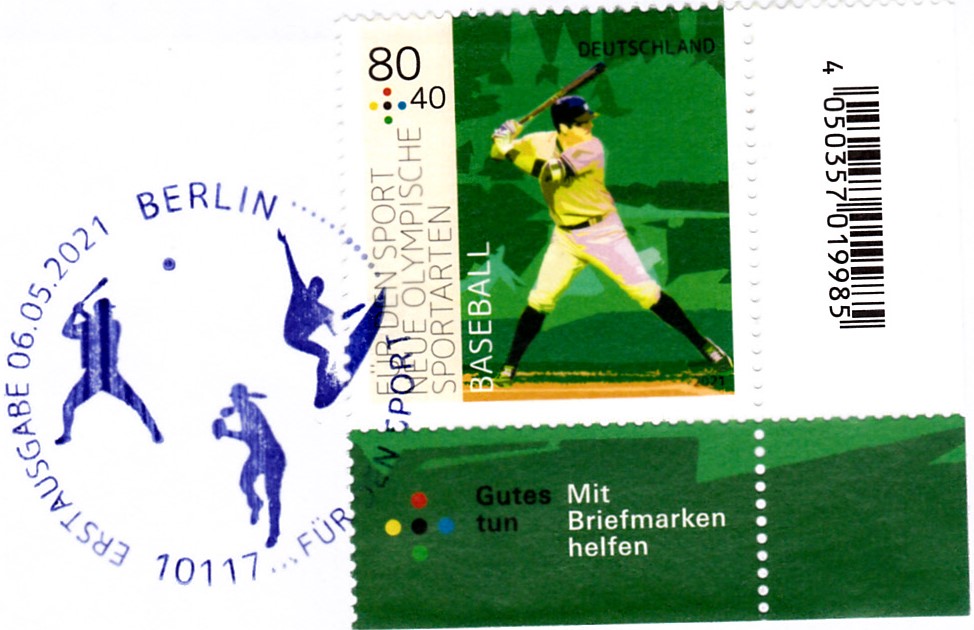 In der Serie "Für den Sport" 2021 ist bei der Deutschen Post auch eine Marke (MiNr 3602) zur neuen Olympischen Sportart Baseball erschienen. Hier zeige ich ein Eckrandstück mit EAN-Codierung.