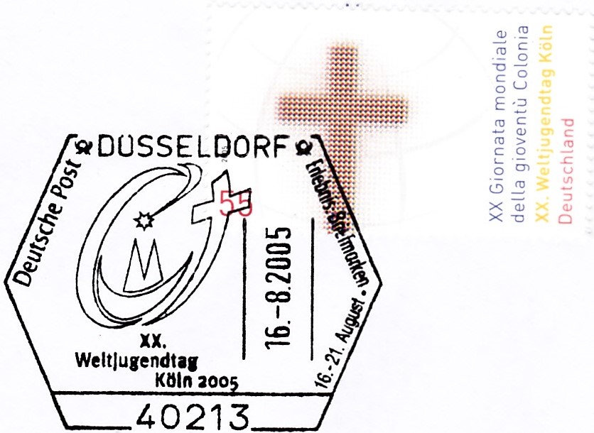 Dazu zeige ich hier den Sonderstempel aus Köln vom 16.8.2005 auf einem Brief nach Cuxhaven. Als Frankatur wurde passend die Marken zum Weltjugendtag (MiNr 2469) verwendet.