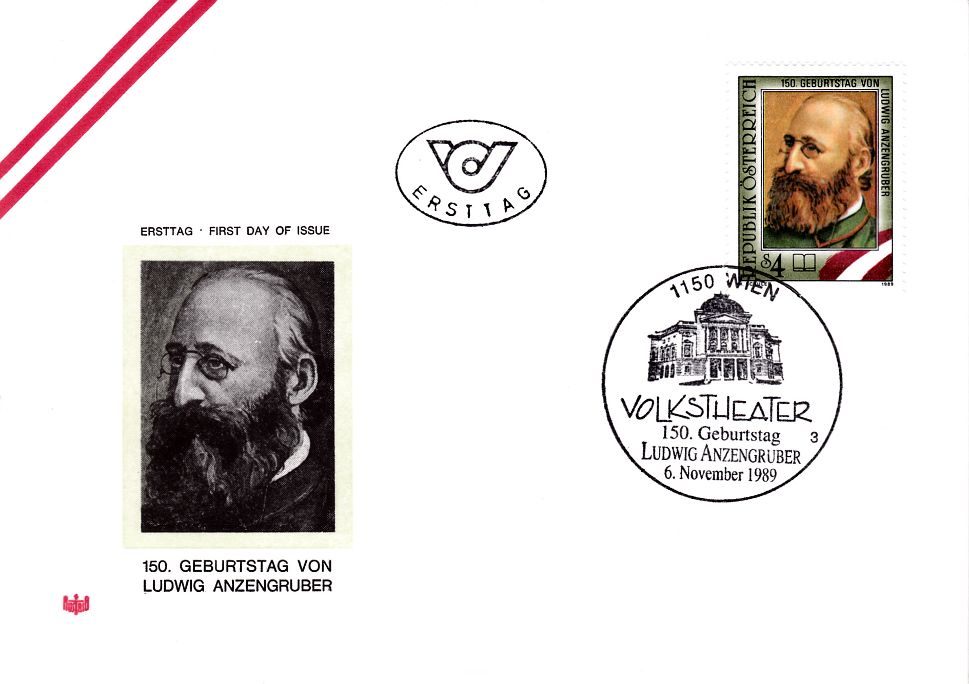Zum 150. Geburtstag von Ludwig Anzengruber erschien in Österreich eine Marke (MiNr 1975) mit seinem Porträt.