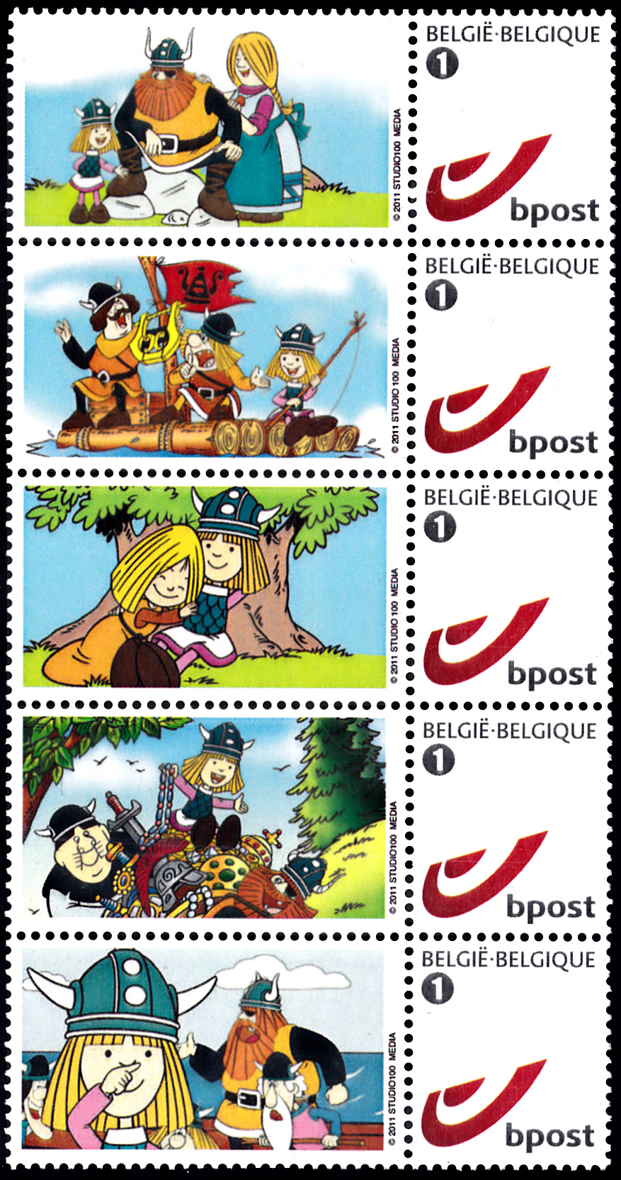 Es folgt heute ein Fünferstreifen mit fünf Marken MiNr 4130 (rechter Teil) und fünf Zierfelder zum Thema ""Wickie".