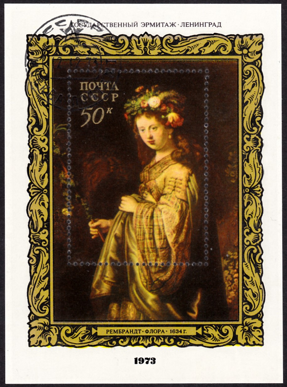 Aus der Sowjetunion kommt dieser Block (MiNr Block 92 mit Marke MiNr 4194) mit dem Gemälde "Saskia als Flora" von Rembrandt van Rijn.