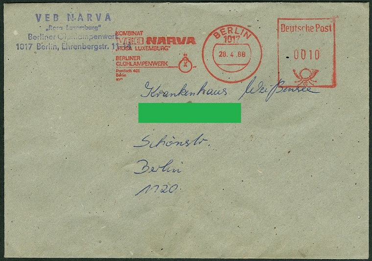 Der Absender, der VEB Narva Kombinat Berliner Glühlampenwerk, war der zentrale Hersteller für Leuchtmittel, insbesondere Glühlampen, in der Deutschen Demokratischen Republik, kurz DDR.