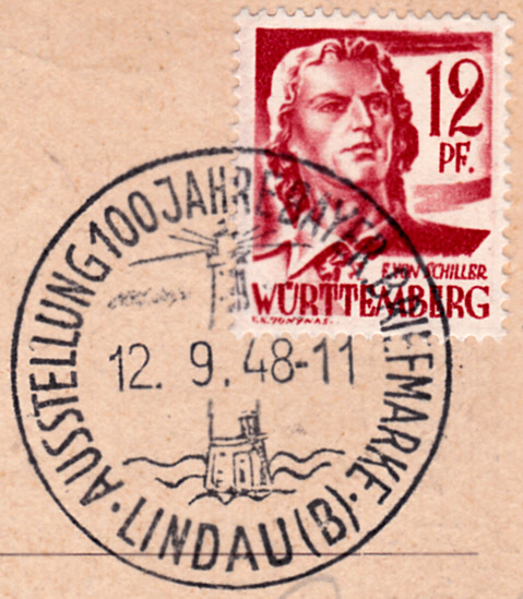 Dieser Stempel aus Lindau vom 12.9.1948 zeigt im Stempelbild den Leuchtturm Lindau.