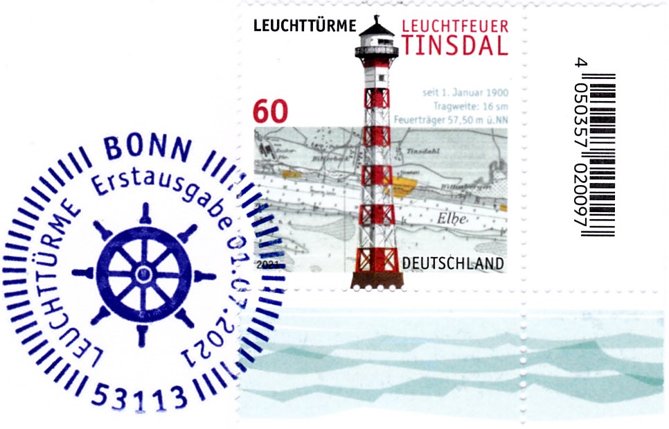 Am 1. Juli 2021 erschien bei der Deutschen Post in der Serie Leuchttürme ein Postwertzeichen im Nennwert von 60 Eurocent (MiNr 3615) mit dem Leuchtturm Tinsdal. Hier zeige ich ein Eckrandstück mit EAN-Codierung.