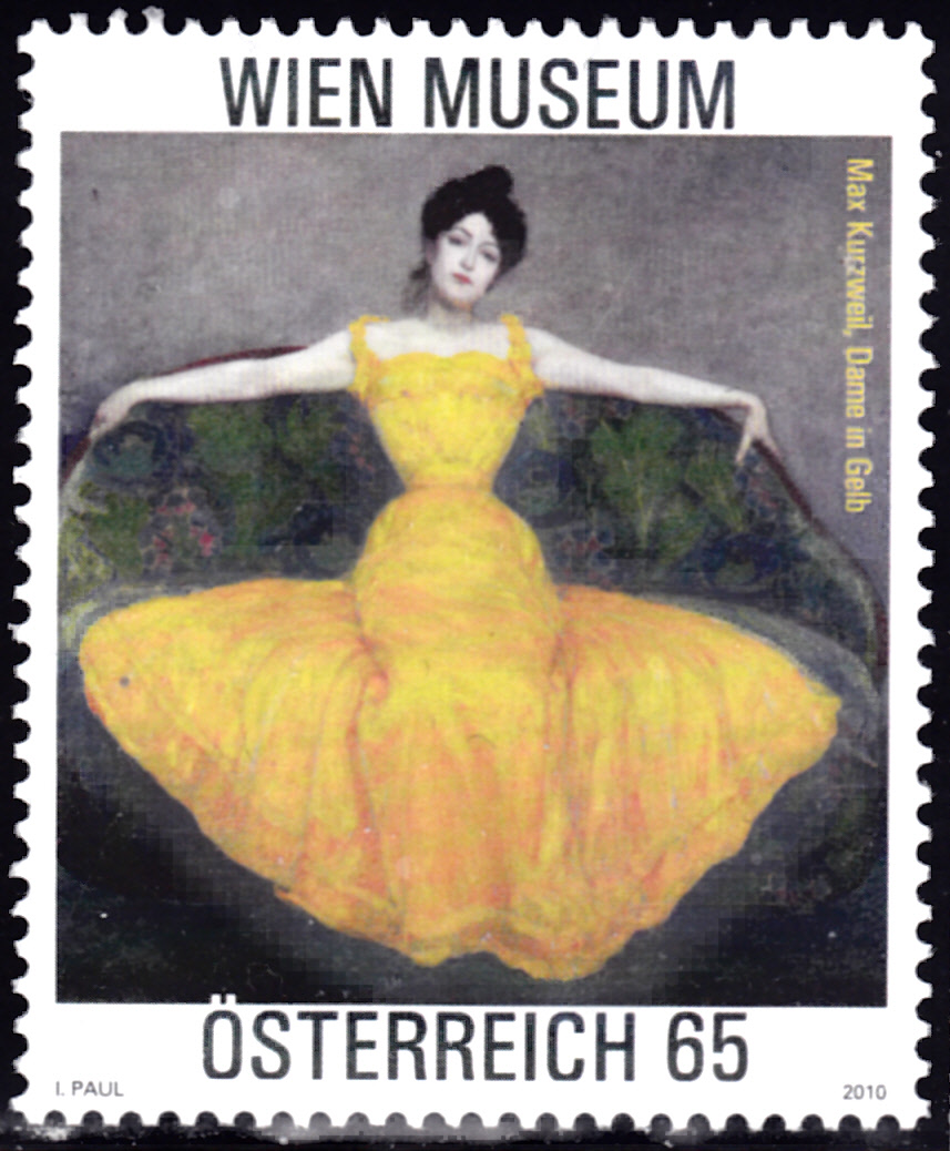 Auf einer Marke aus Österreich (MiNr 2859) zum Thema "Kunstwerke aus dem Wien-Museum" ist das Gemälde "Dame in Gelb" von Max Kurzweil abgebildet.