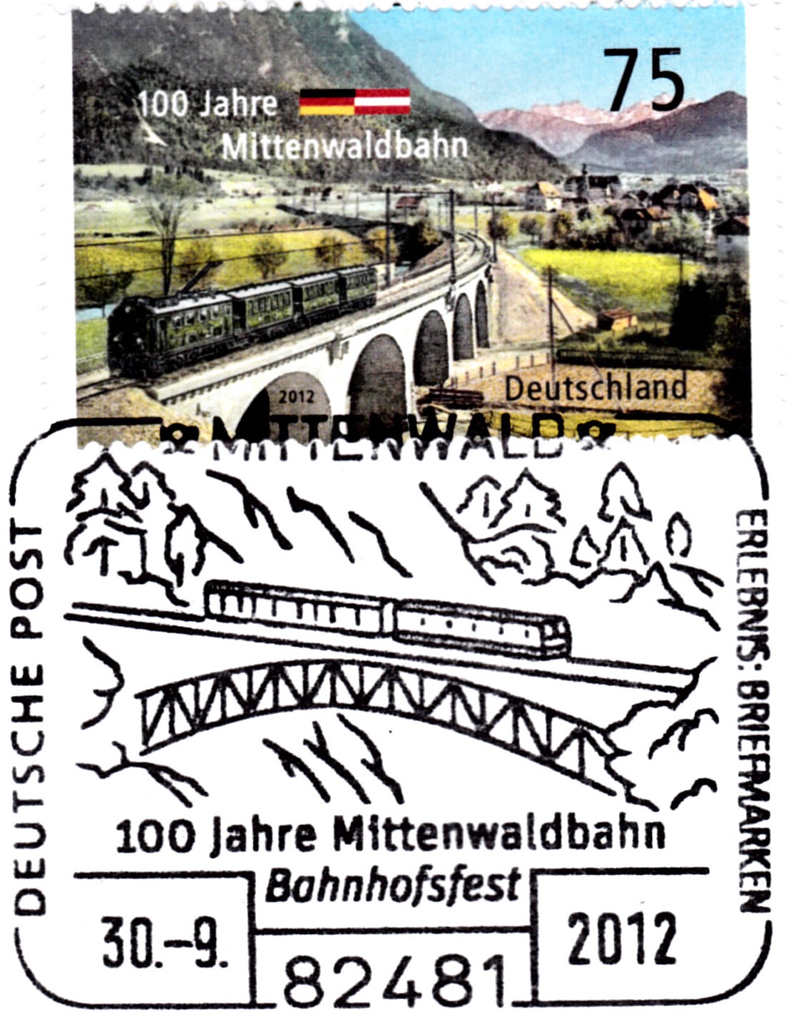 Sonderstempel aus Mittenwald vom 30.9.2012 zum Bahnhofsfest aus Anlass "100 Jahre Mittenwaldbahn.