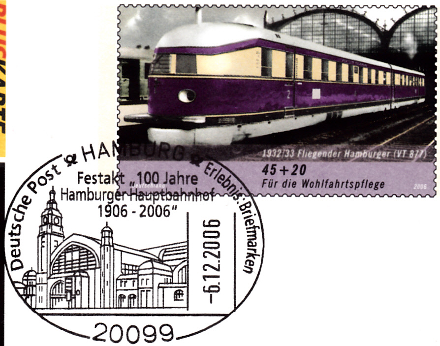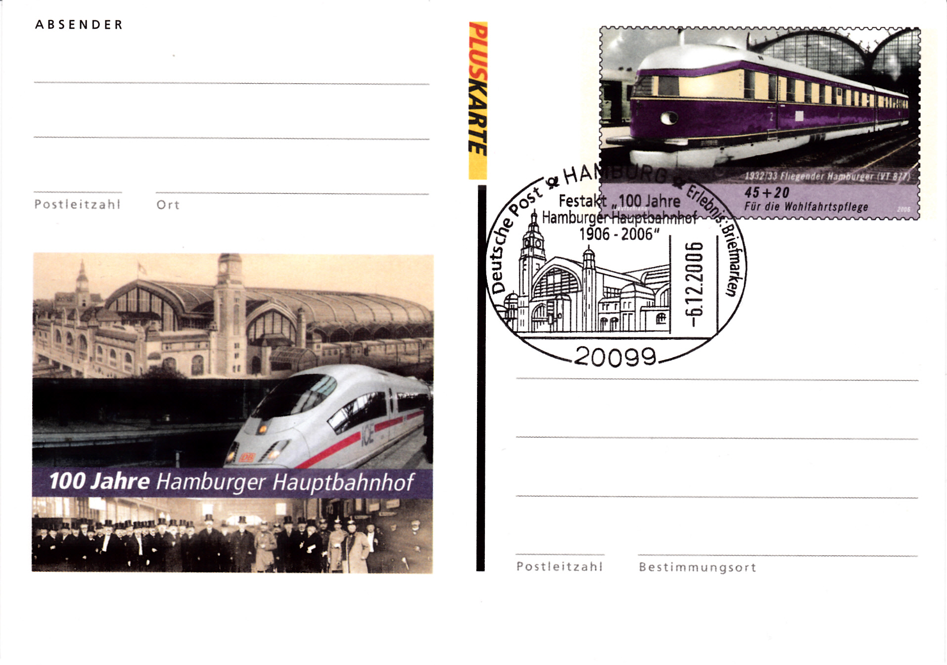 Es gibt auch eine Gedenkpostkarte zum 100-jährigen Bestehen des Hamburger Hauptbahnhofes mit dem Wertstempel der auf der vorhergehenden Seite gezeigt Jugendmarke mit dem "Fliegenden Hamburger". Hier eine mit dem dazu passenden Sonderstempel gestempelte aber leider nicht gelaufene Karte.