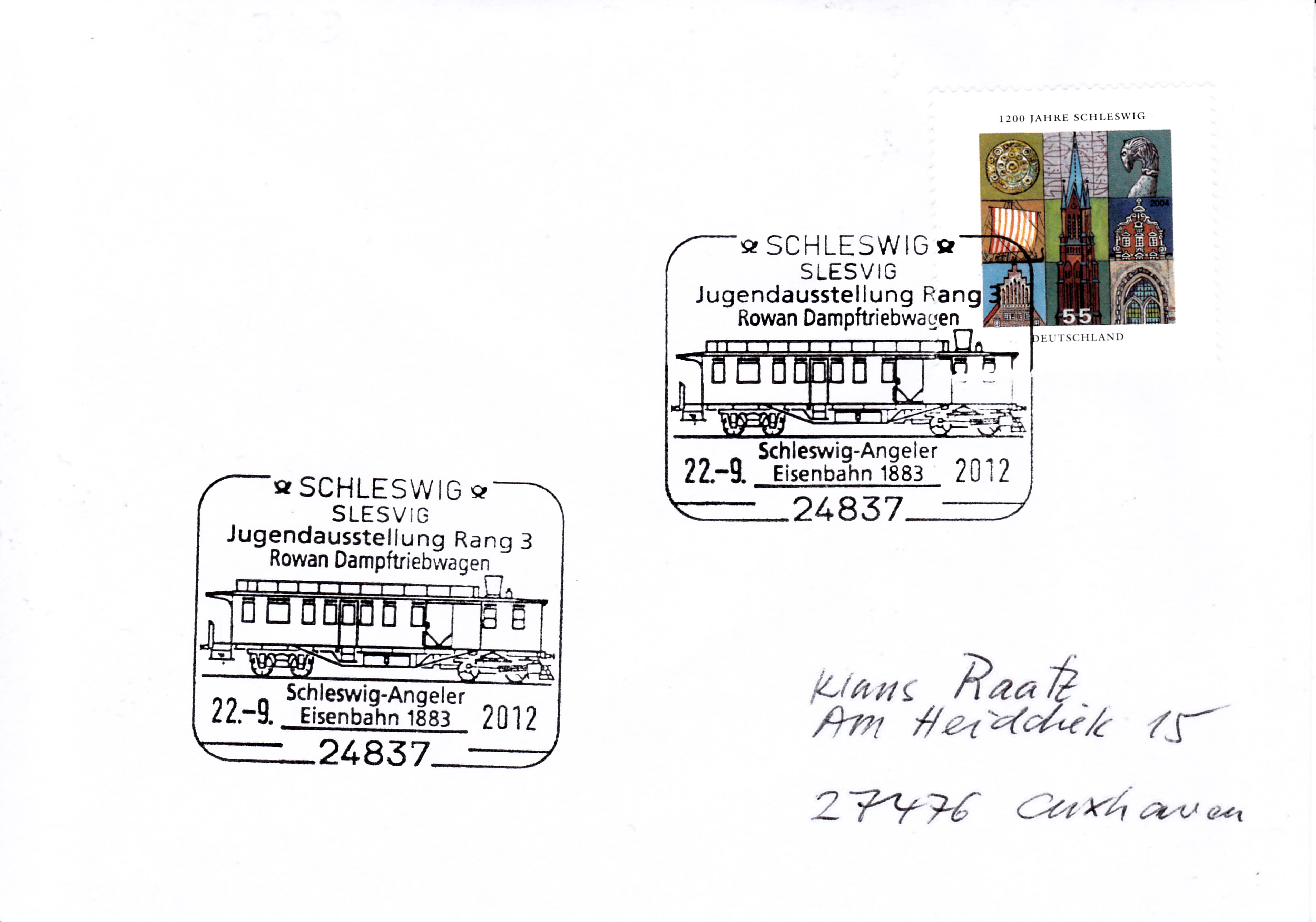 Im Sonderstempel vom 22.9.2012 aus Schleswig zur Jugendbriefmarkenausstellung JUBRIA 2012 ist ein Rowan Dampftriebwagen abgebildet. Interessant ist bei diesem Stempel auch der zweisprachige Ortsname.