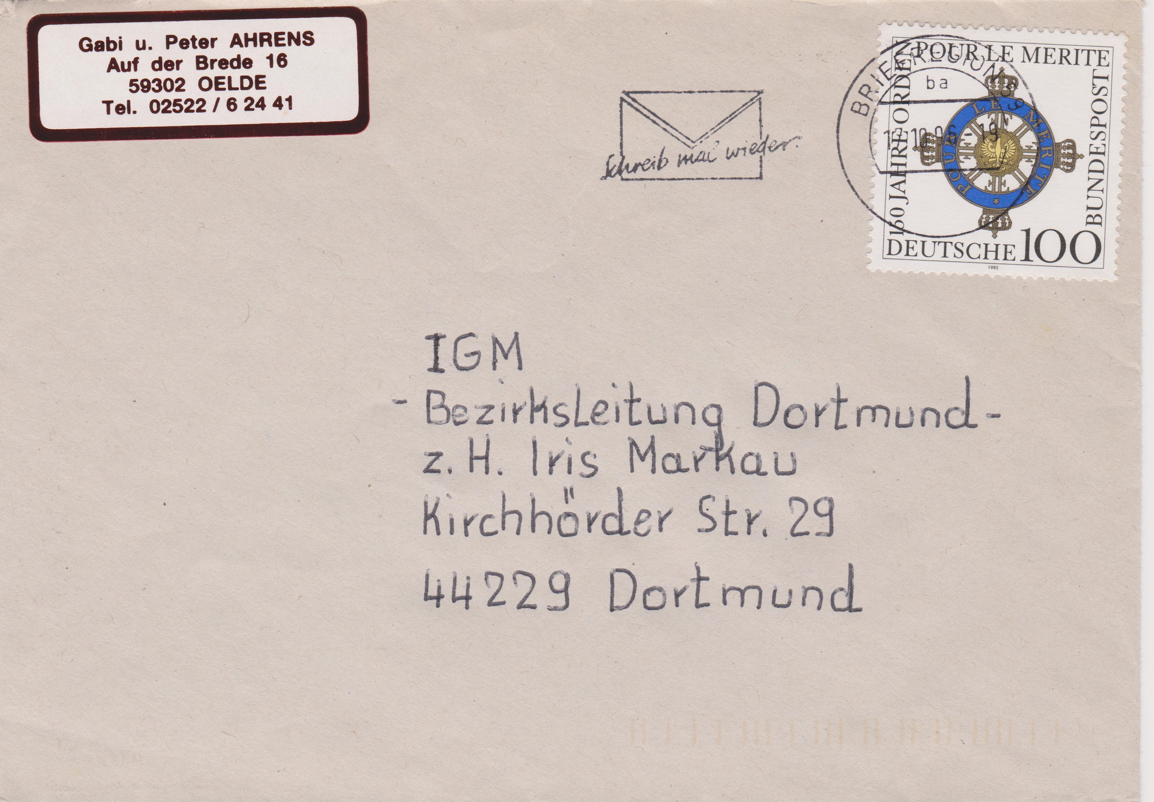 Bund MiNr. 1613 erschien am 07.05.1992 zum 150jährigen Jubiläum dieses Ordens, hier als portogerechte Einzelfrankatur auf Brief: