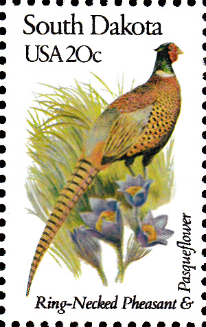 In der Serie "Vögel und Blumen der 50 Bundesstaaten" erschien in den USA eine Marke, (MiNr 1572) die einen Fasan (Phasianus colchicus) zeigt. Die Marke gibt es in zwei Zähnungen: A = gez. K 11 1/4 und F = gez. L 10 3/4:11 1/4.