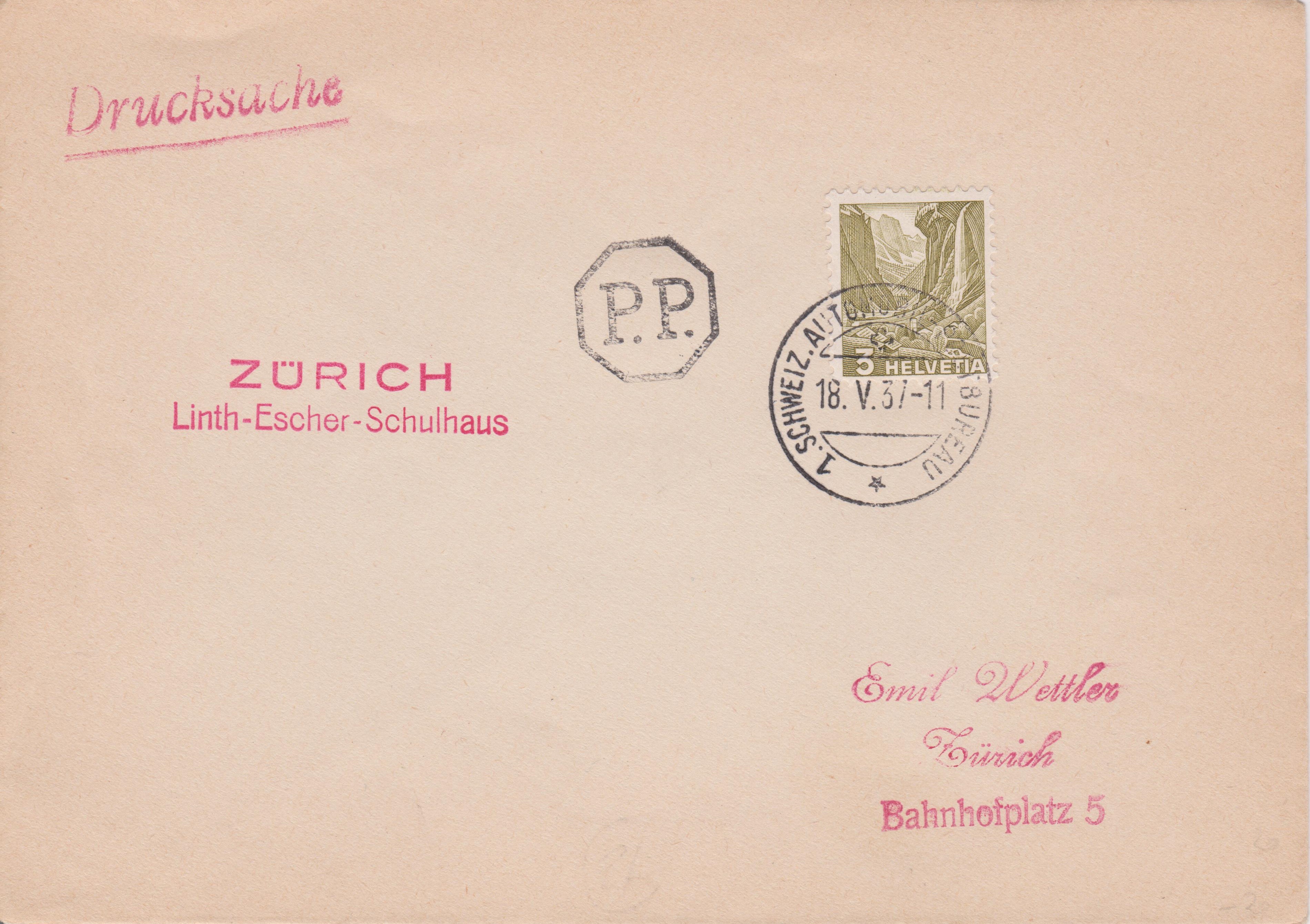 Diese Drucksache wurde am 18.05.1937 um 11 Uhr in ZÜRICH am Linth-Escher-Schulhaus beim "1. SCHWEIZ. AUTOMOBILPOSTBUREAU" aufgegeben: