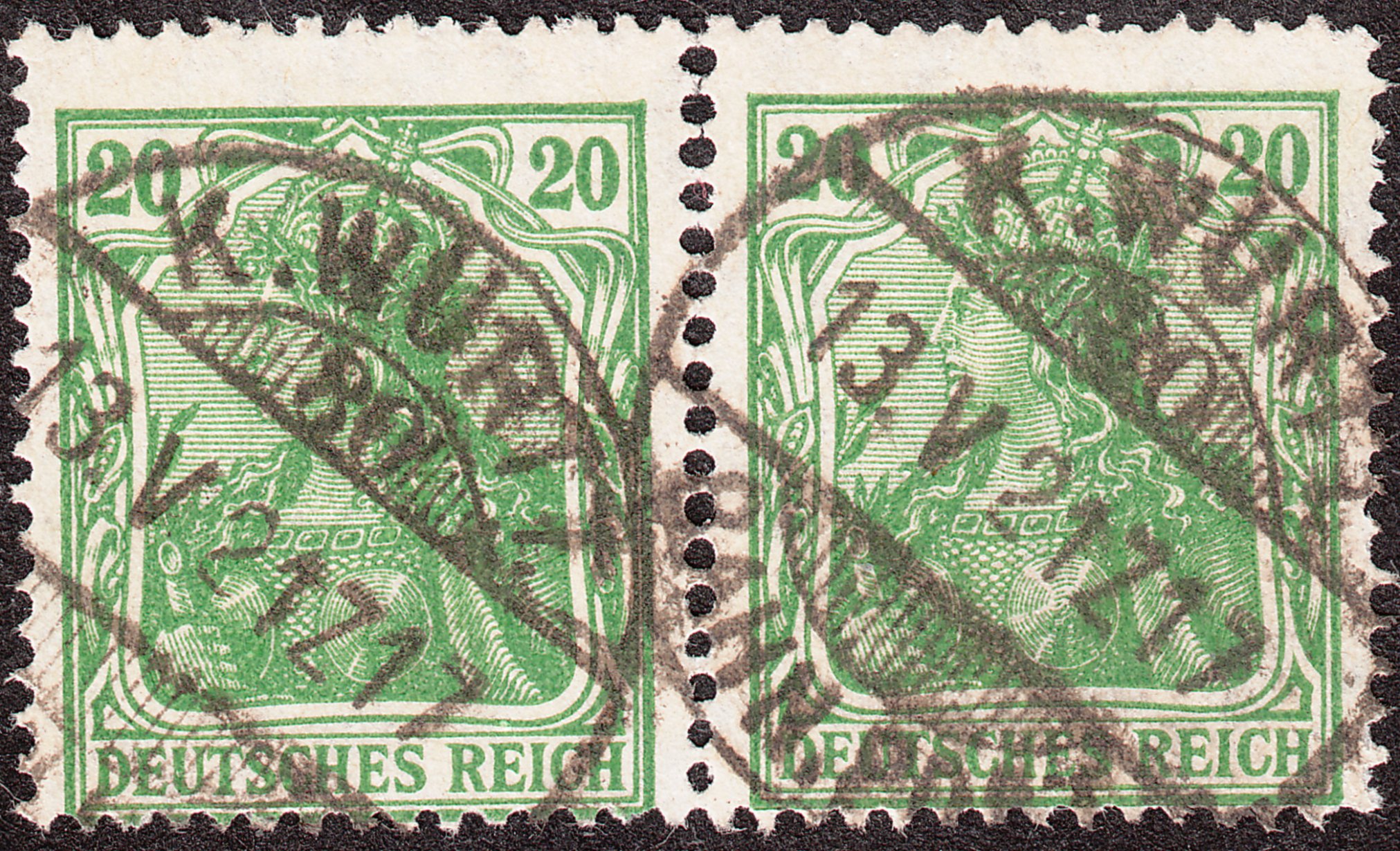 Foren-Übersicht Fragen und Diskussion Postgeschichte Germania Inschrift "DEUTSCHES REICH" Paar der MiNr. 143 württembergischer Bahnpoststempel Zug 17
