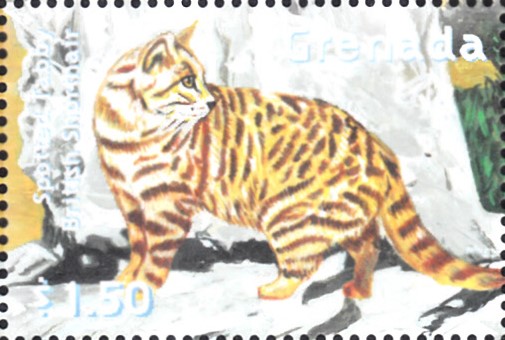 Auf dieser Marke aus Grenada (MiNr 4248) wird eine Britisch-Kurzhaar mit getupfter Tabbyzeichnung gezeigt.