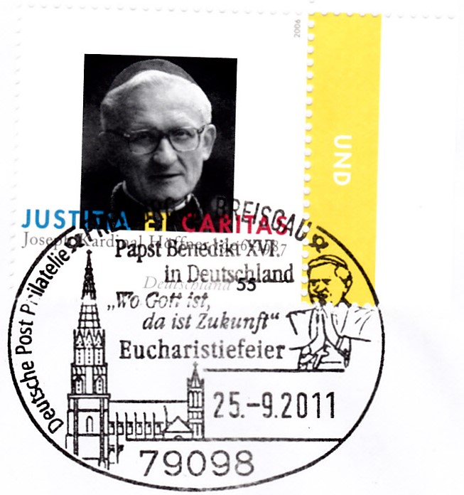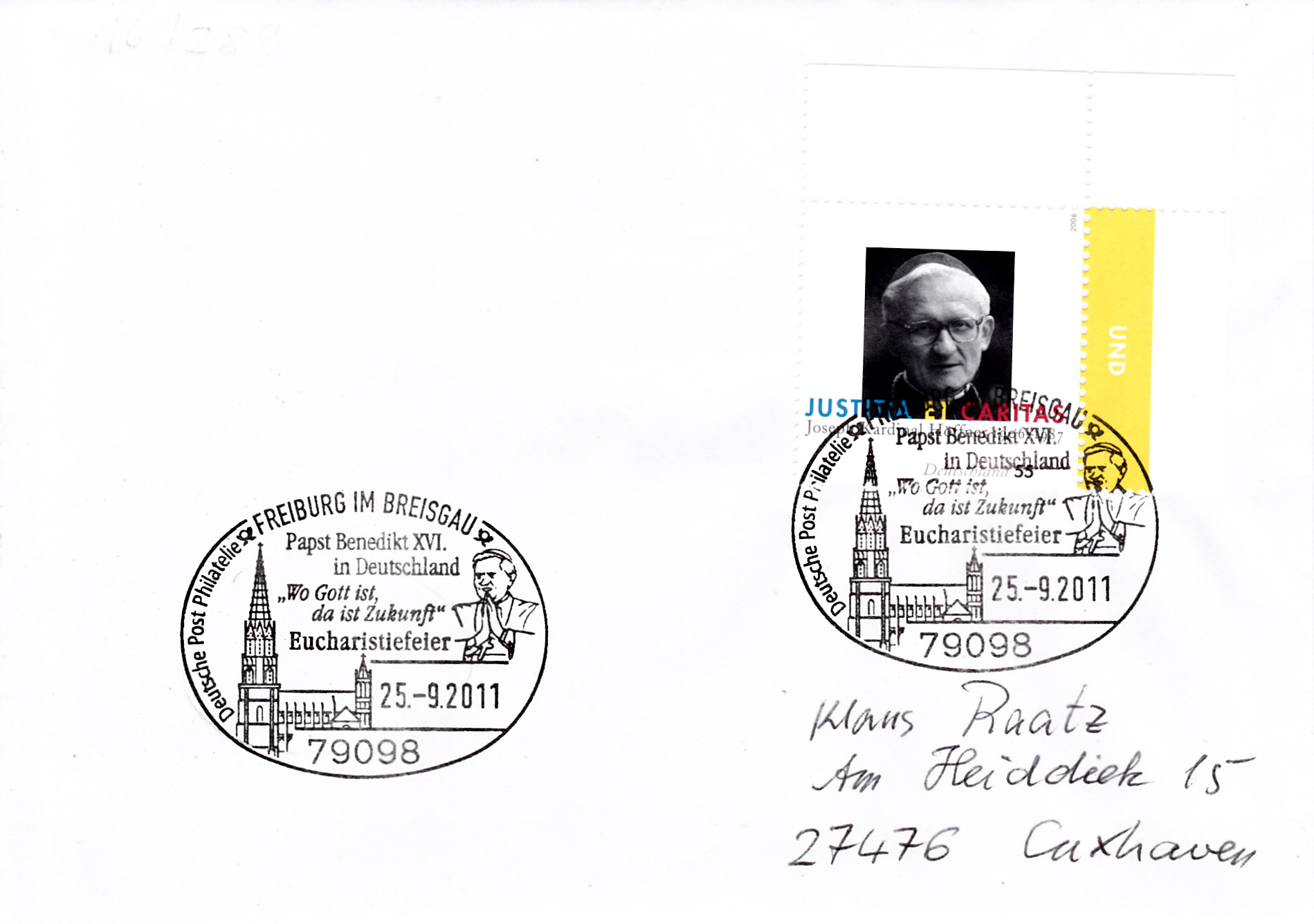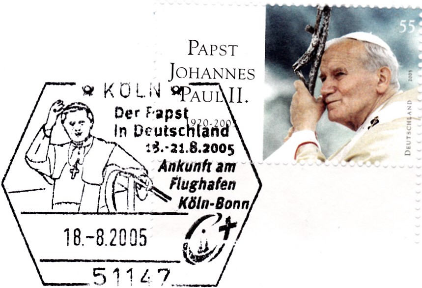 Dazu zeige ich hier den Sonderstempel aus Köln vom 16.8.2005 auf einem Brief nach Cuxhaven. Als Frankatur wurde passend die Marken zum Weltjugendtag (MiNr 2469) verwendet.