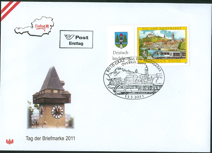 Hier zeige ich eine postfrische Marke zum Tag der Briefmarke 2011 (MiNr 2936). Sie zeigt eine Stadtansicht von Graz und einen Triebwagen Typ Desiro der S-Bahn Graz.