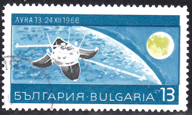 Auf dieser Marke aus Bulgarien (MiNr 1762) wird die aufgeklappte Mondlandesonde "Luna 13" nach der weichen Landung auf dem Mond gezeigt.