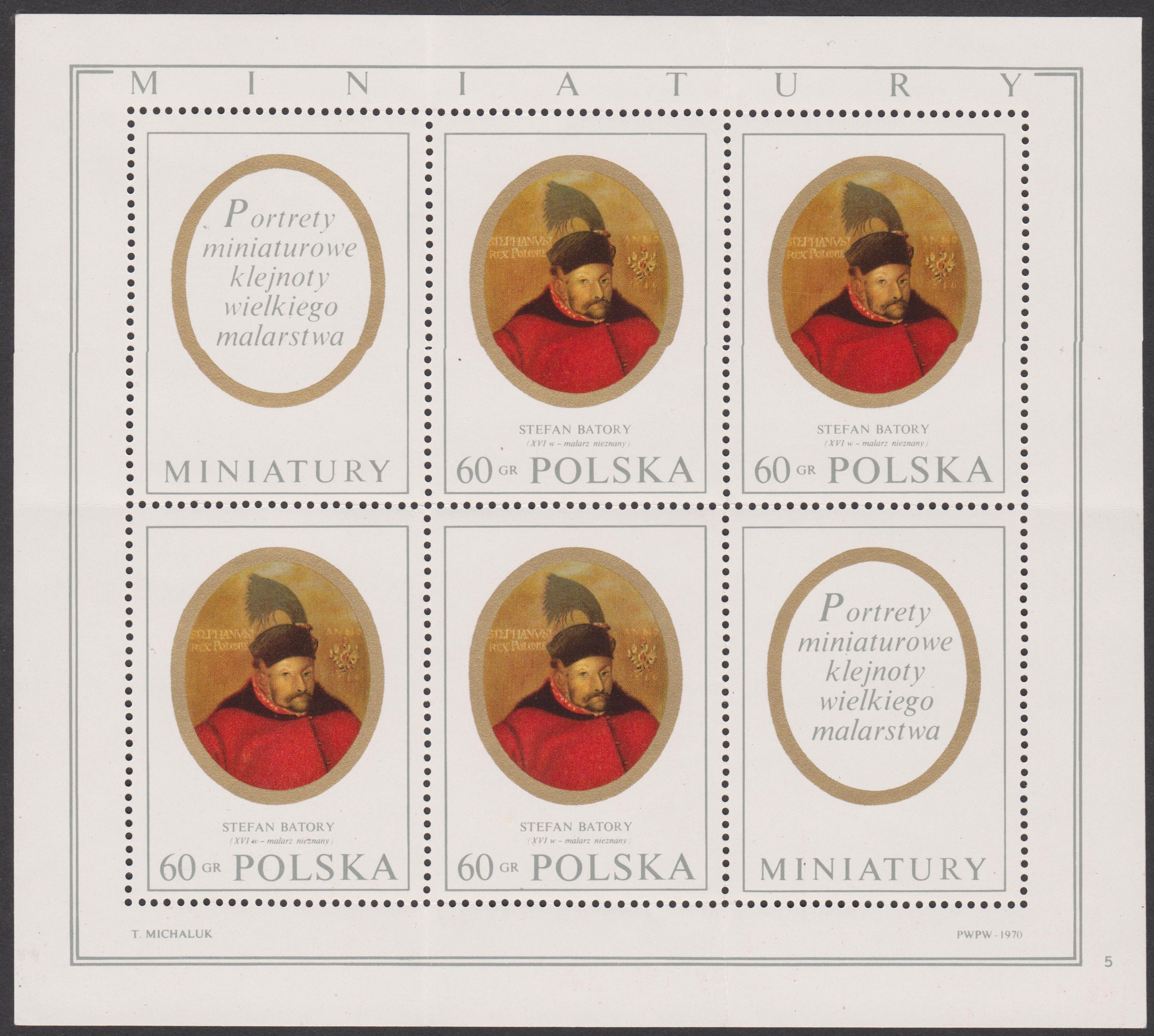 Polen MiNr. 2019 zeigt sein Bildnis auf einer Miniaturmalerei eines unbekannten Malers, hier im Kleinbogen: